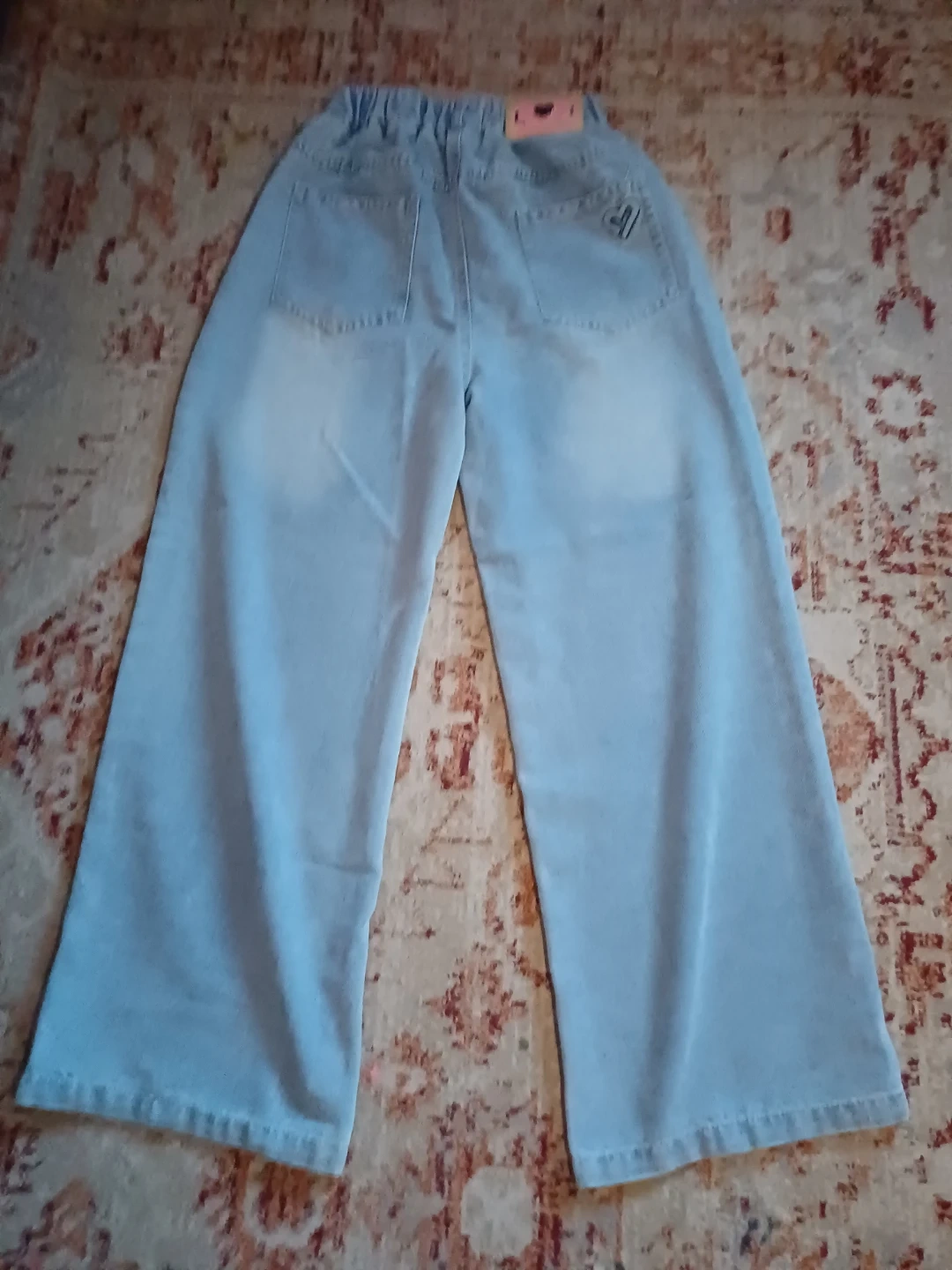 Selling a pair of light wash, wide leg jeans. They're brand new and ready for a new wardrobe! Perfect comfy, casual, stylish look.