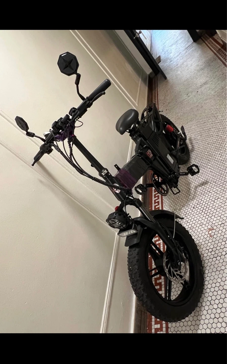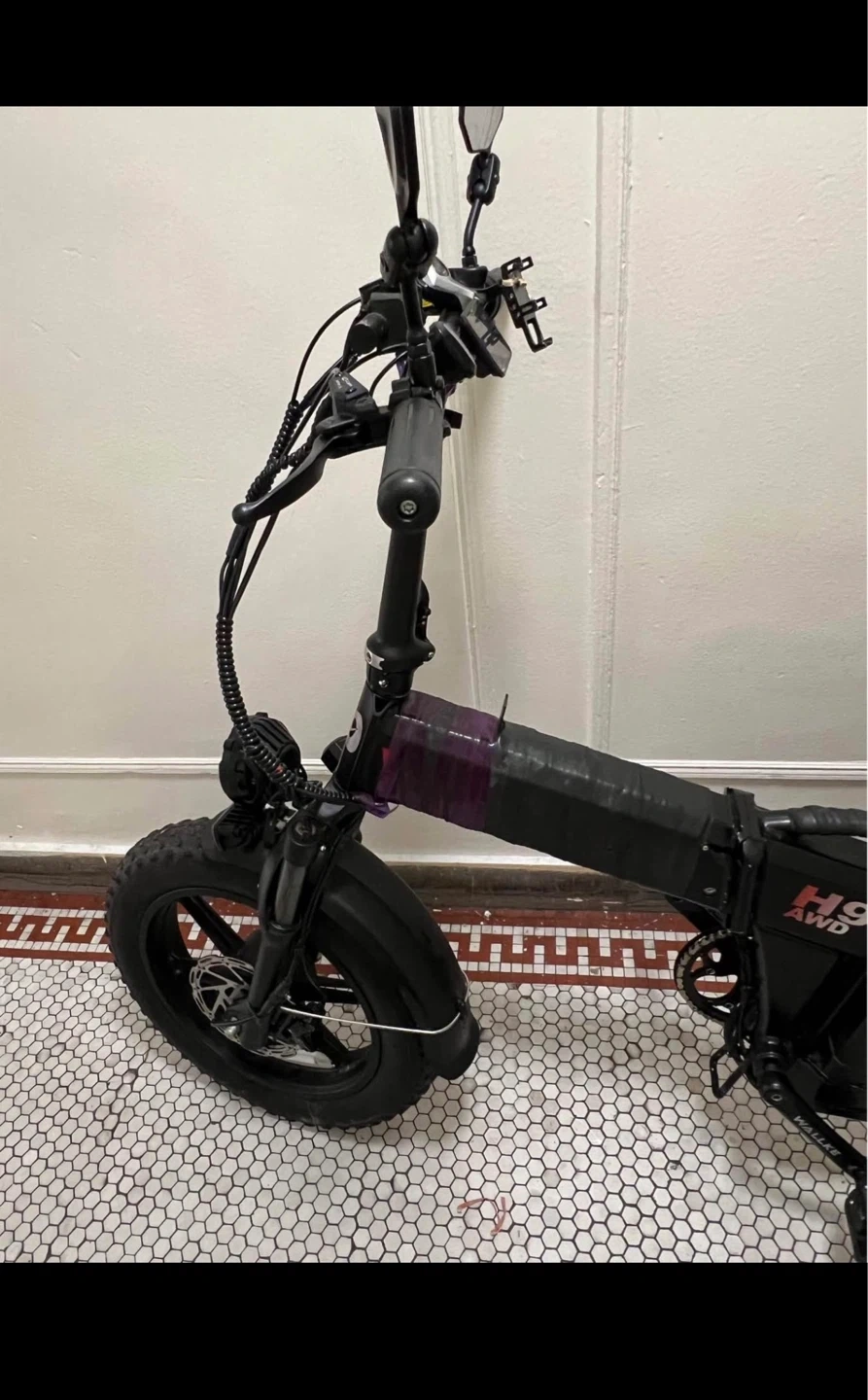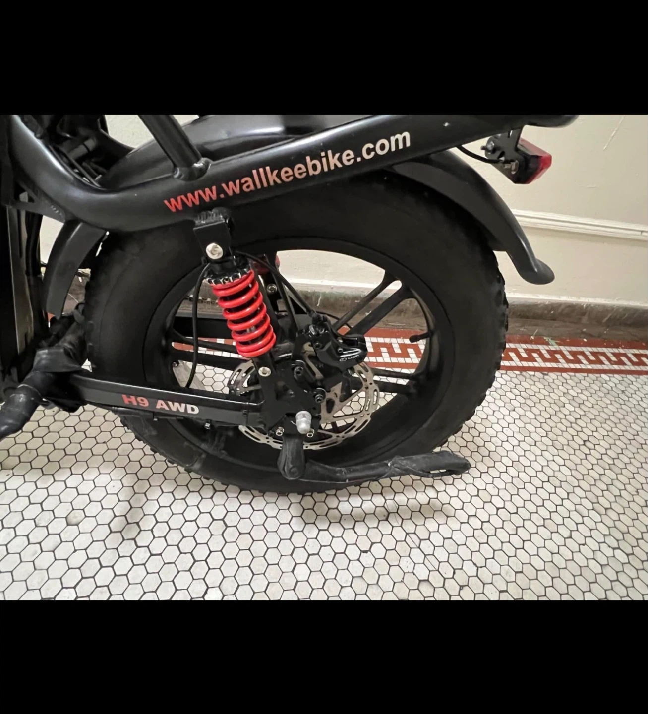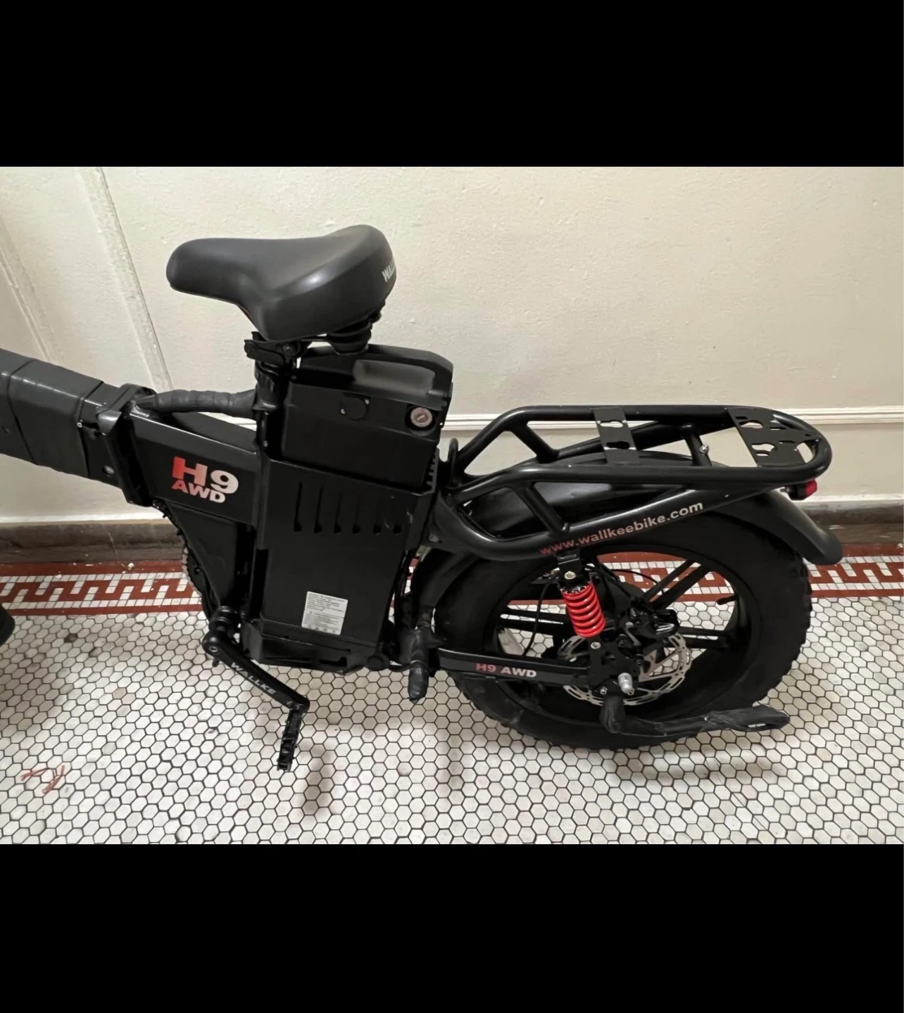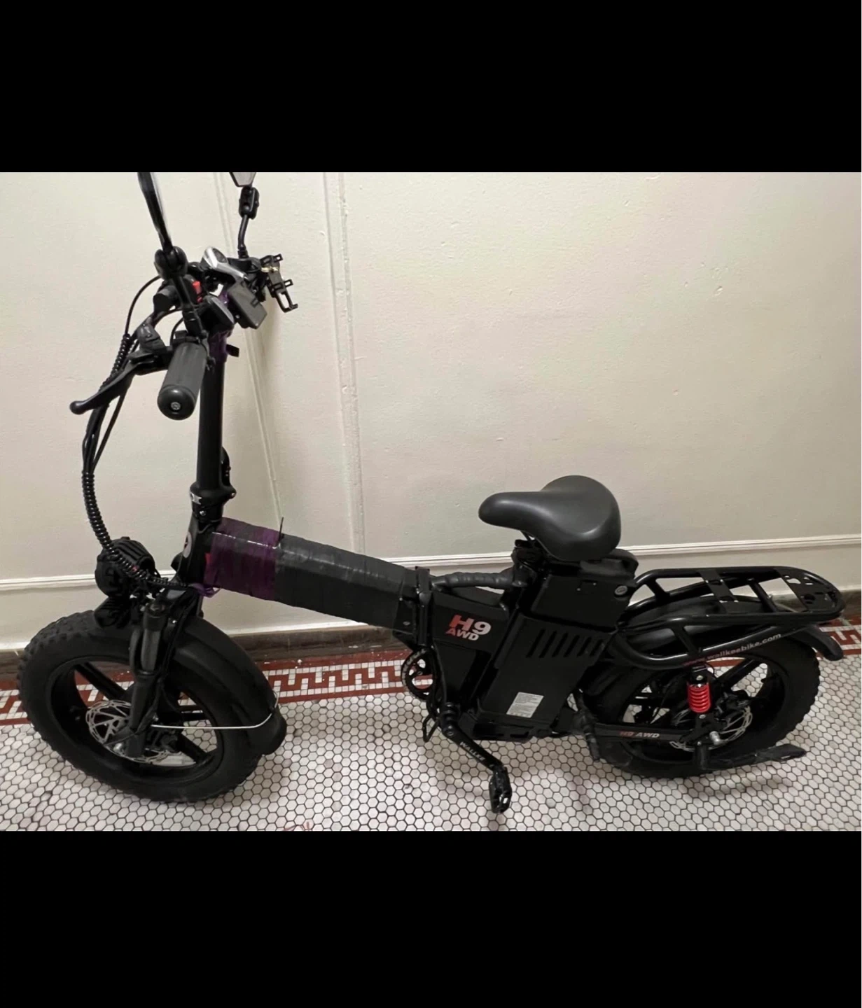 This is a WALLKE H9 4WD electric folding bike in black. It features fat tires for improved traction and a rear rack for cargo. It's a convenient option for commuting or recreational rides! It comes with a charger and the battery comes out (only accepting cash)