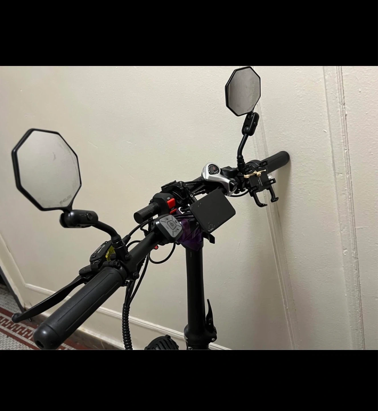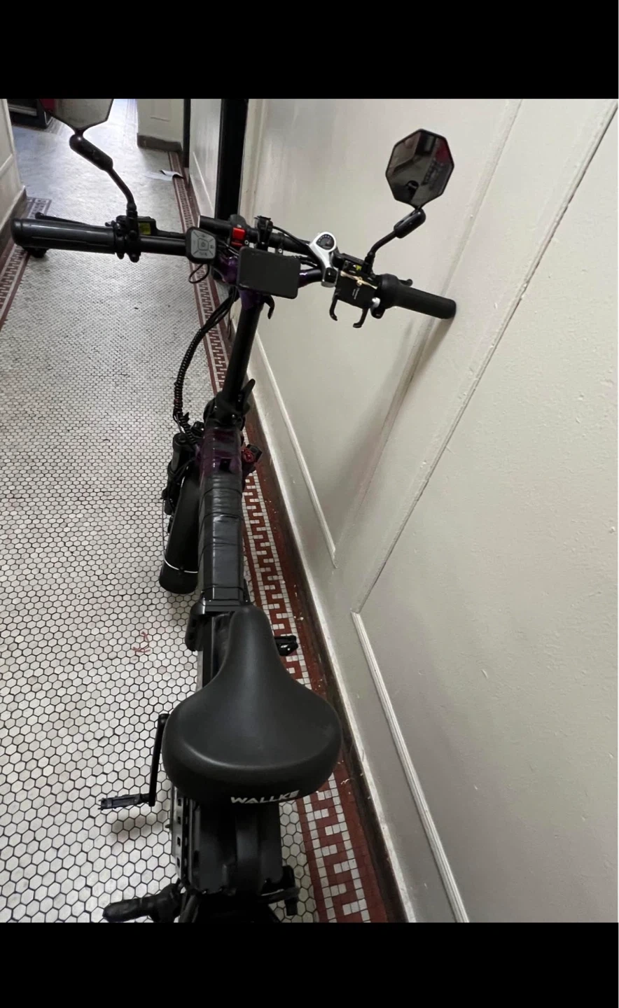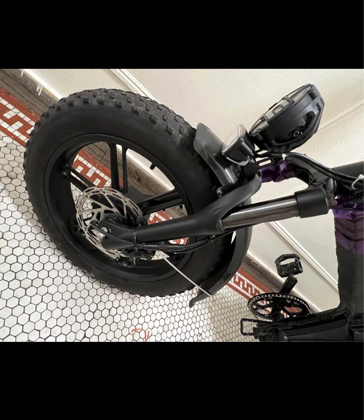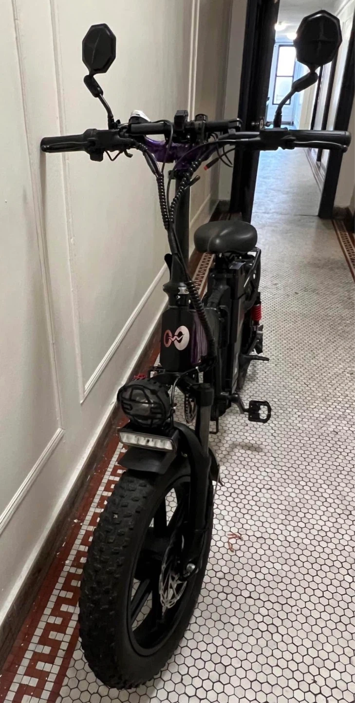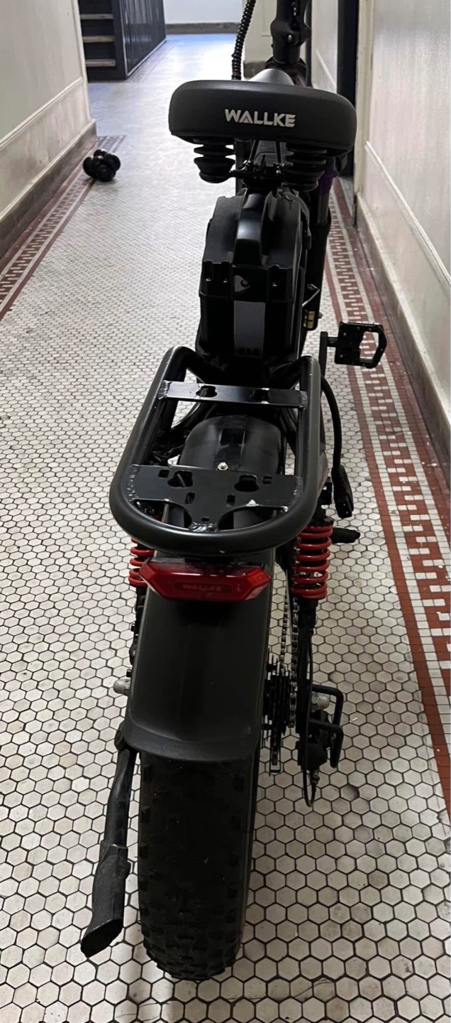 This is a WALLKE H9 4WD electric folding bike in black. It features fat tires for improved traction and a rear rack for cargo. It's a convenient option for commuting or recreational rides! It comes with a charger and the battery comes out (only accepting cash)