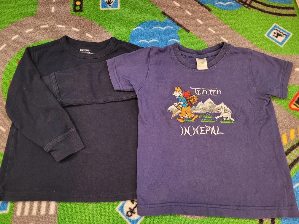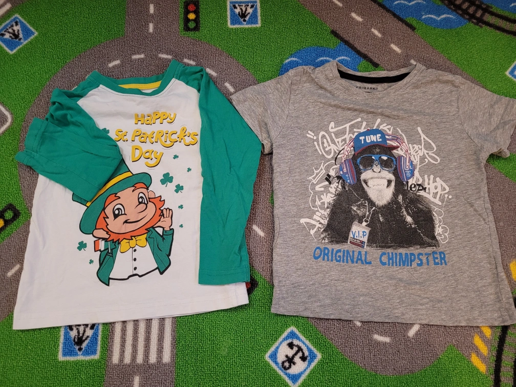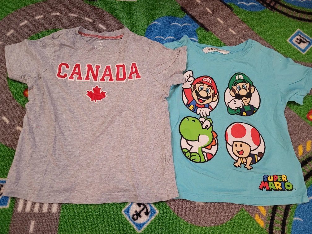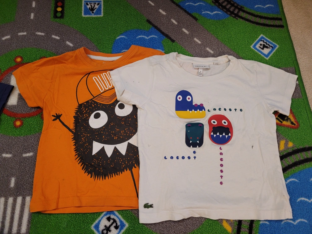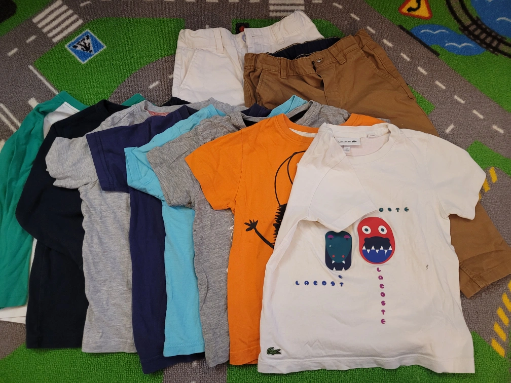 bundle of boys' clothing. Includes short and long sleeve t-shirts, featuring various designs and colours. Some shirts show minor wear. Sizes are approximately 3T-4T. Two pairs of boys' pants included.