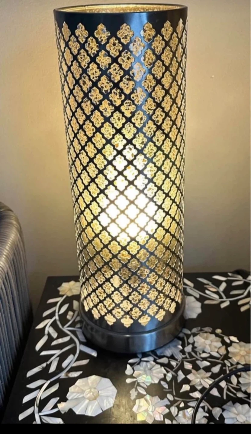 A stylish table lamp with a decorative metal lattice shade. It casts a warm, ambient glow when lit. This lamp's unique design adds a touch of elegance to any room.
