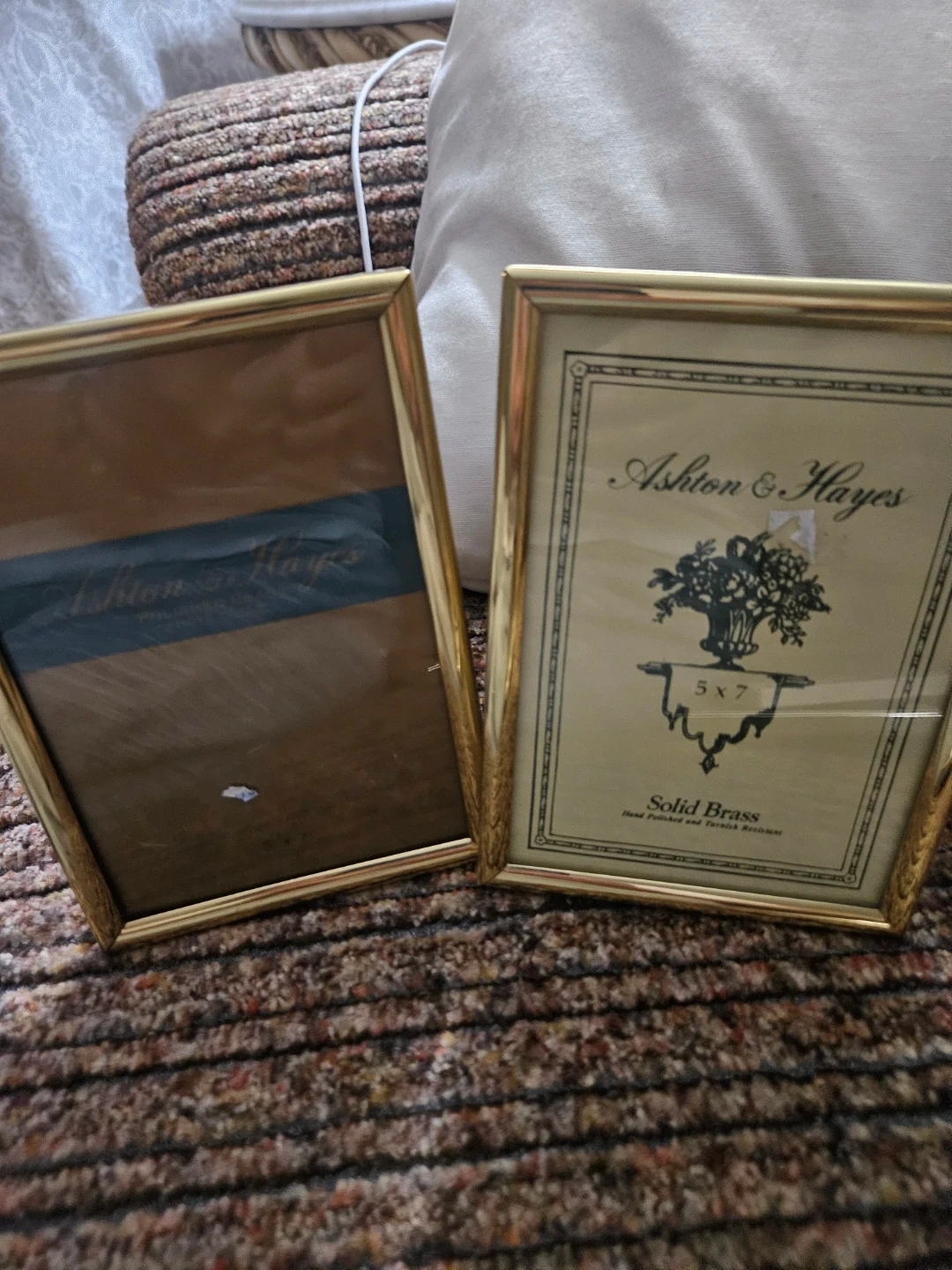 Two Ashton & Hayes photo frames. Both are solid brass with a polished finish. Each frame is sized for a 5x7 photo. They're perfect for displaying your cherished memories!