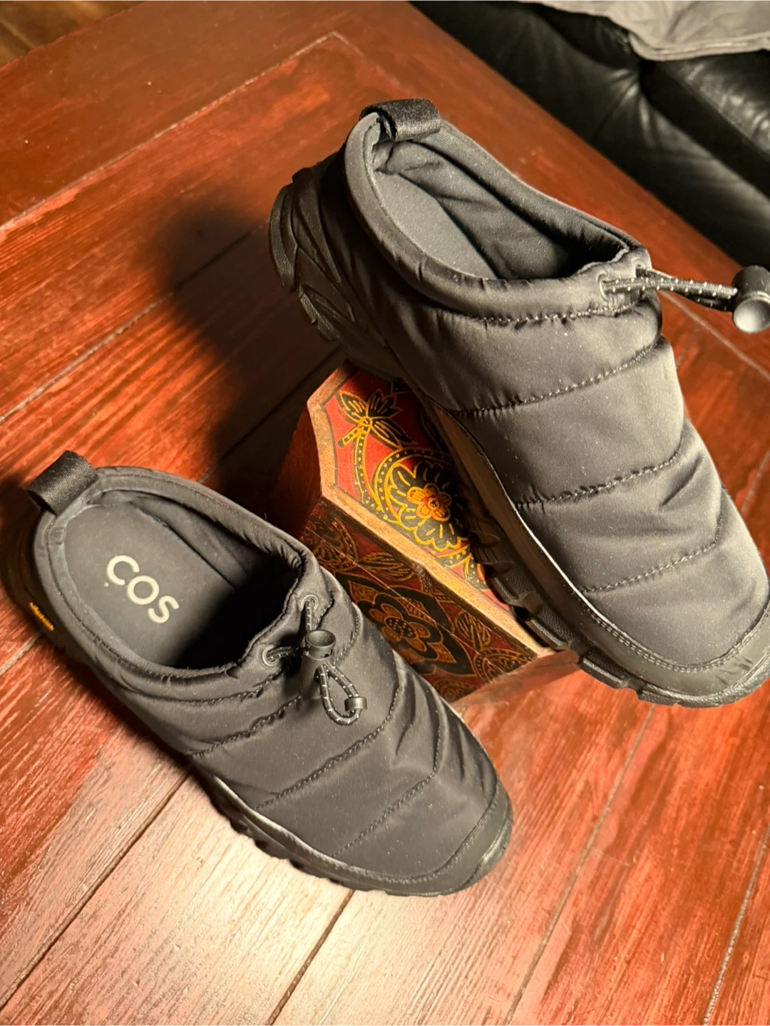 These COS black quilted puffer slip-on shoes are designed for comfort and warmth. They feature a durable Vibram sole for excellent traction. Perfect for casual wear or as cozy house shoes!