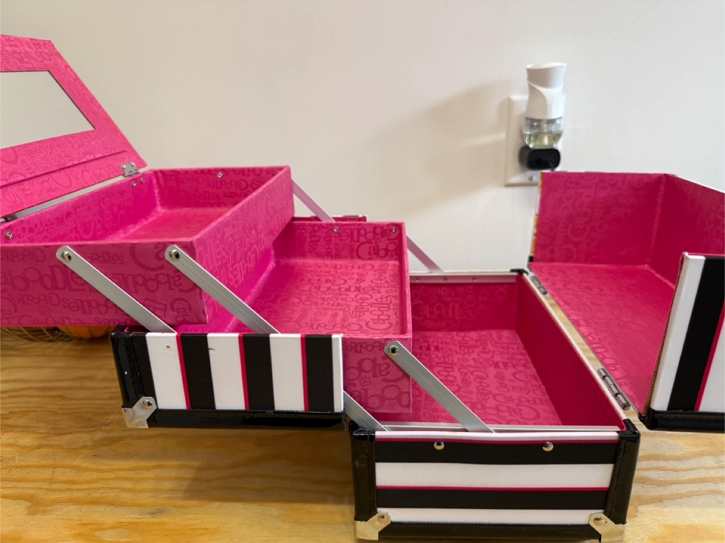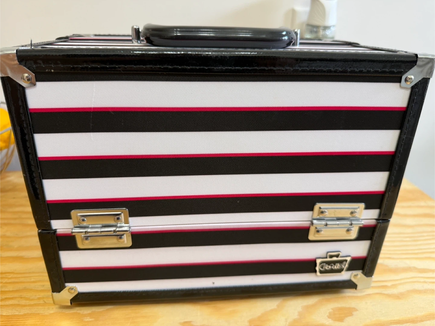 This is a Caboodles train case with a mirror inside. It has multiple trays for organization. The exterior is black and white stripes with pink accents. It's great for storing makeup or craft supplies!