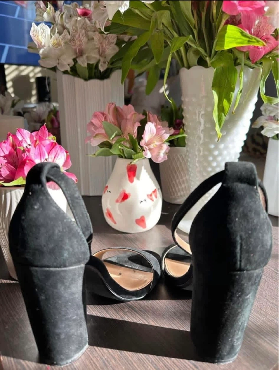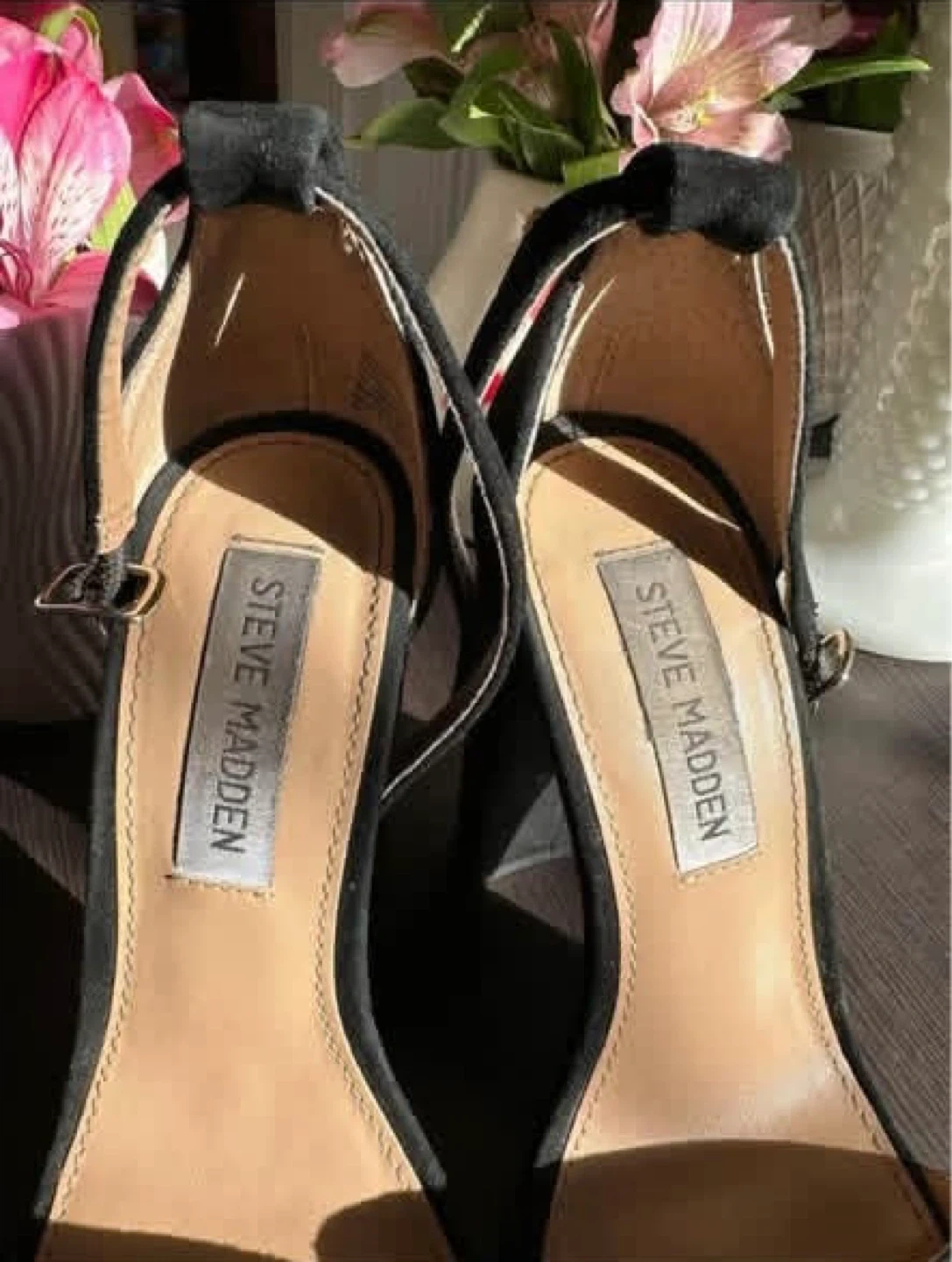 These Steve Madden sandals feature a black suede finish with a comfortable block heel. Adjustable ankle strap closure. Dress them up or down!