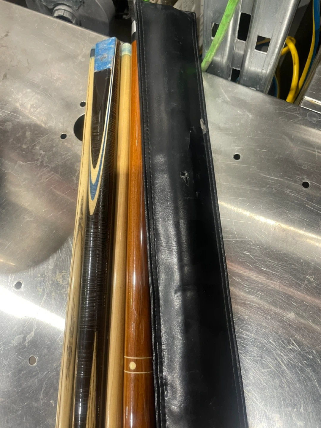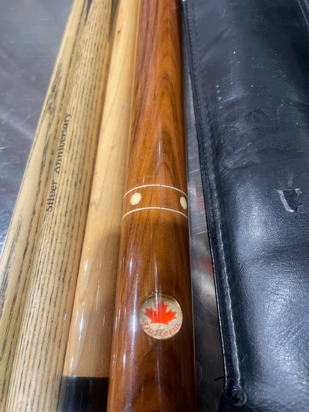 This set includes two Dufferin billiard cues, one featuring a "Silver Anniversary" inscription. Comes with a black faux leather case for storage and transport. Cues have a smooth wood finish with decorative rings and a Dufferin logo on one.Snooker & 8 th ball cue
