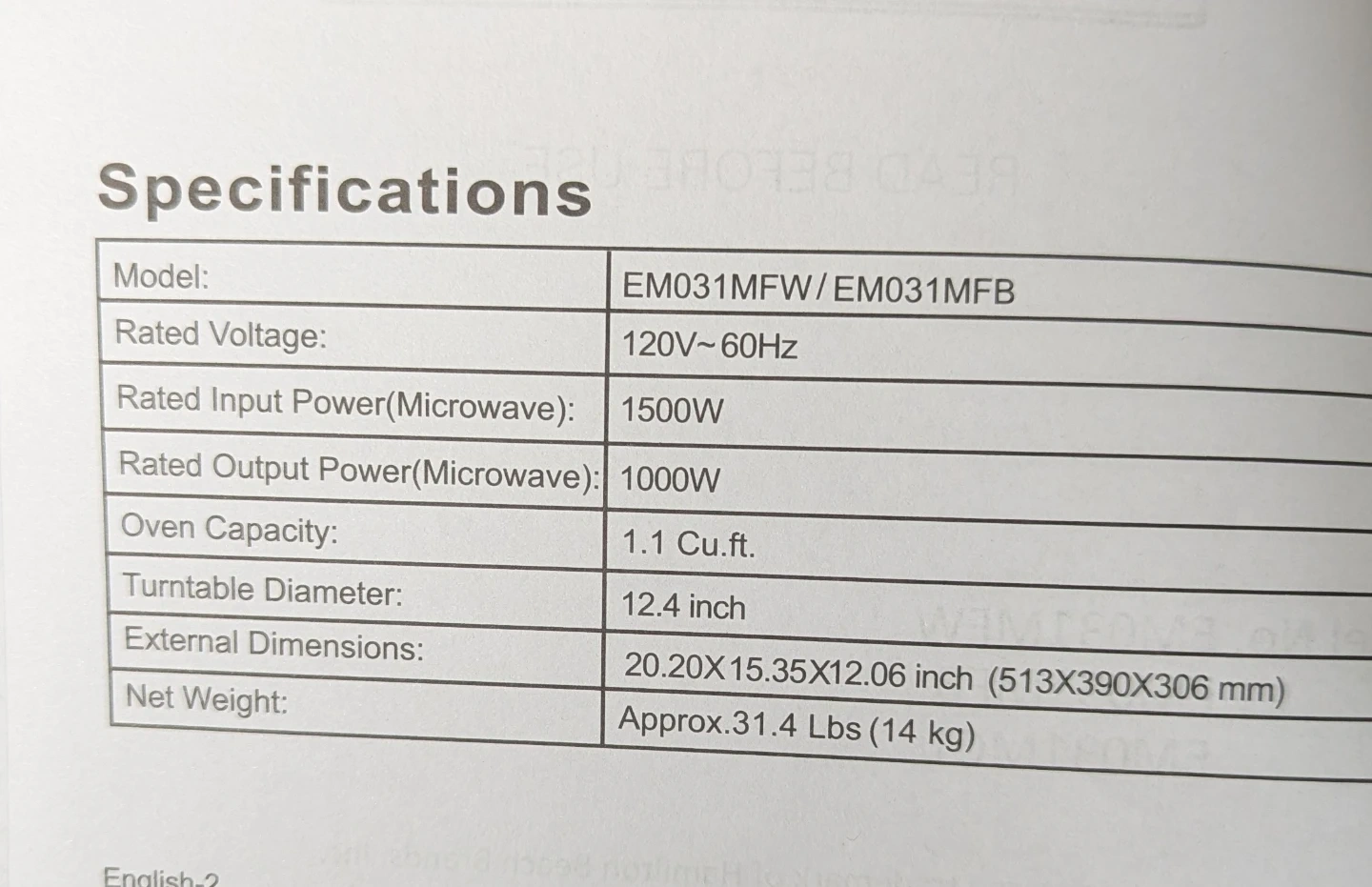 White Hamilton Beach microwave with 1.1 Cu.ft. oven capacity. It has a 12.4 inch turntable diameter and an output power of 1000W. External dimensions are 20.20x15.35x12.06 inches.