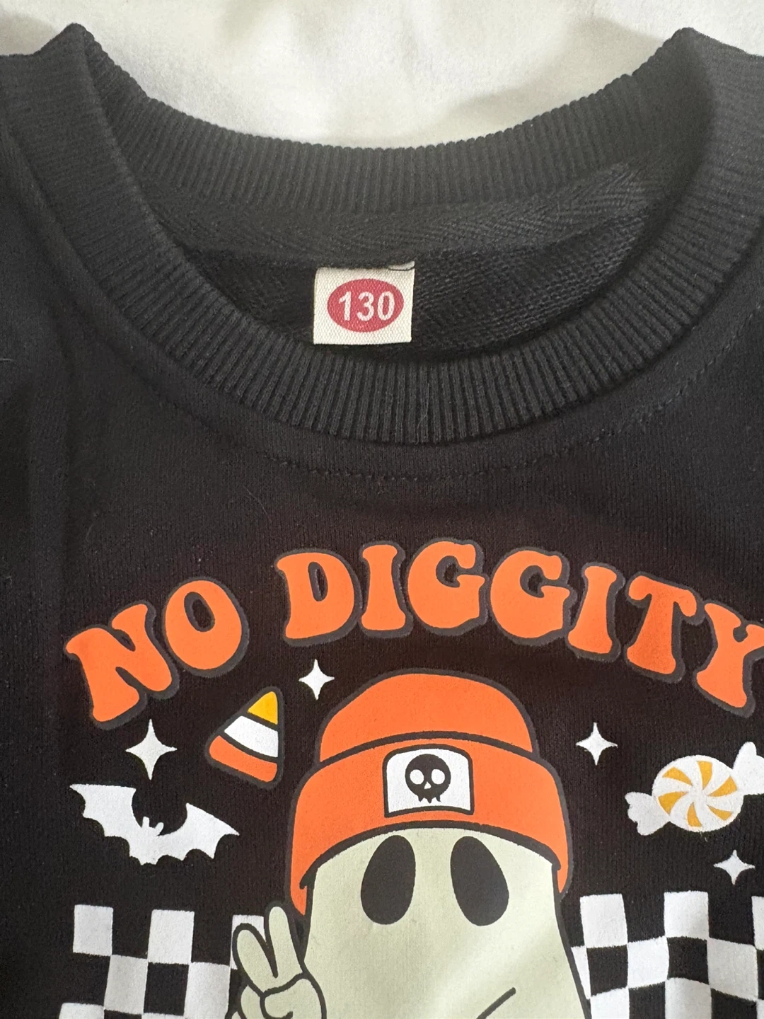Black long-sleeved sweatshirt with a "No Diggity Bout To Bag It Up" Halloween graphic. Features a ghost holding a pumpkin and festive candy designs. Size 130 tag visible.