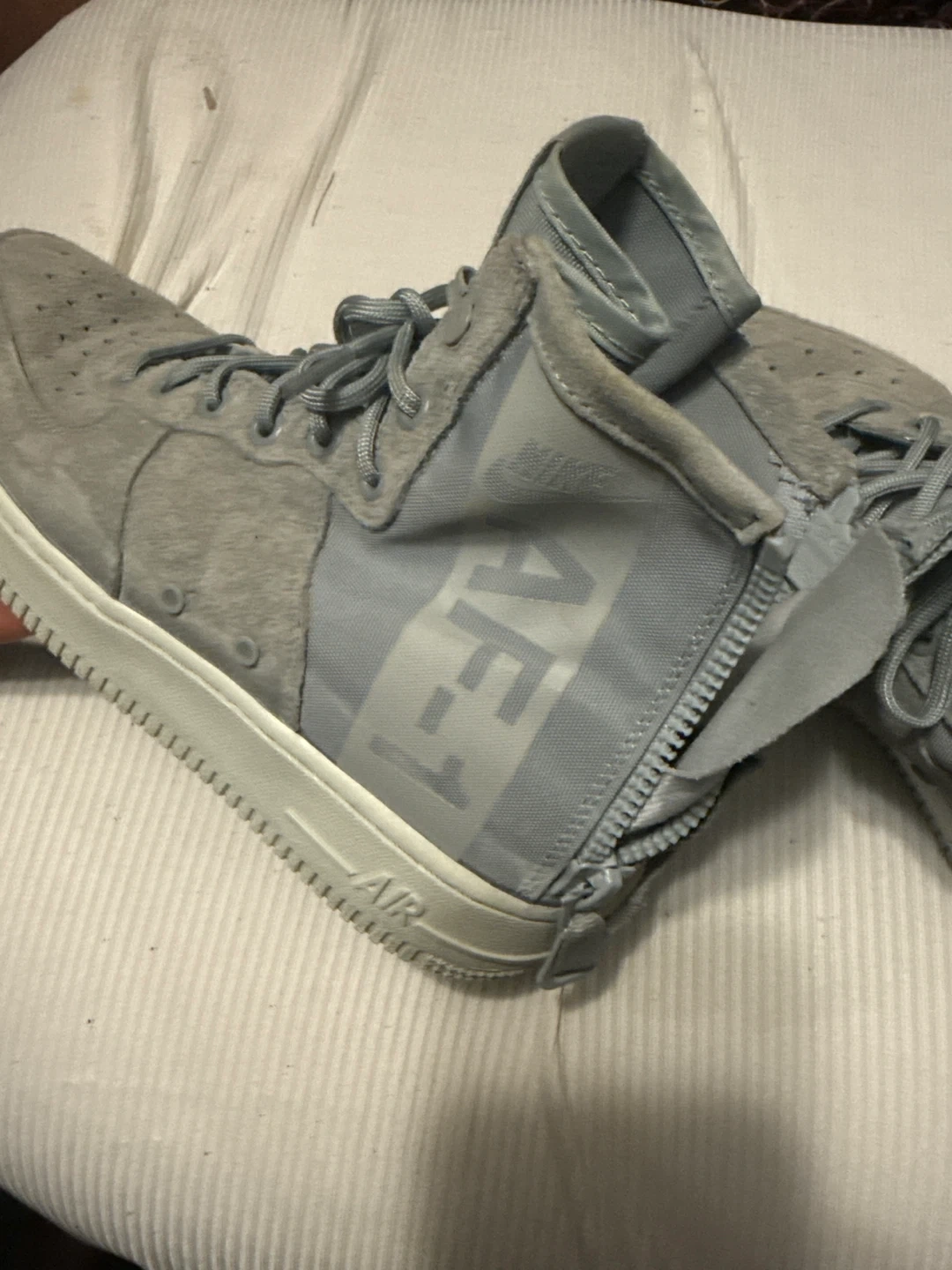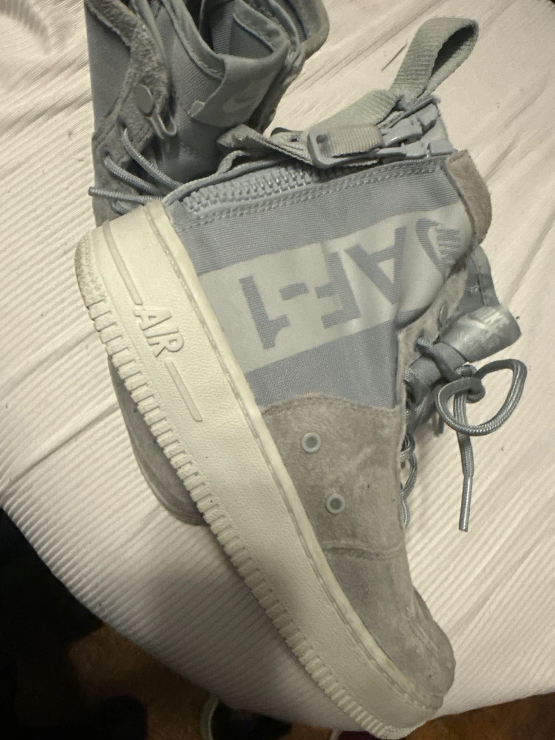 Selling a pair of Nike Air Force 1 High sneakers in grey! They show some signs of wear, but still have lots of life left. These are a stylish and comfortable choice for everyday wear!