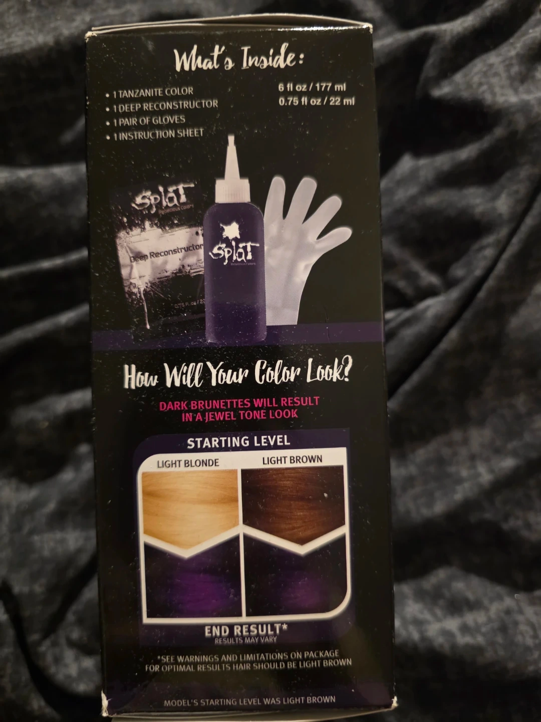 This Splat hair color kit includes 1 tanzanite color, 1 deep reconstructor, 1 pair of gloves, and 1 instruction sheet. It's a no-bleach needed, long-lasting hair color designed for brunettes. The formula conditions your hair while coloring for dramatic results. Box has not been opened.