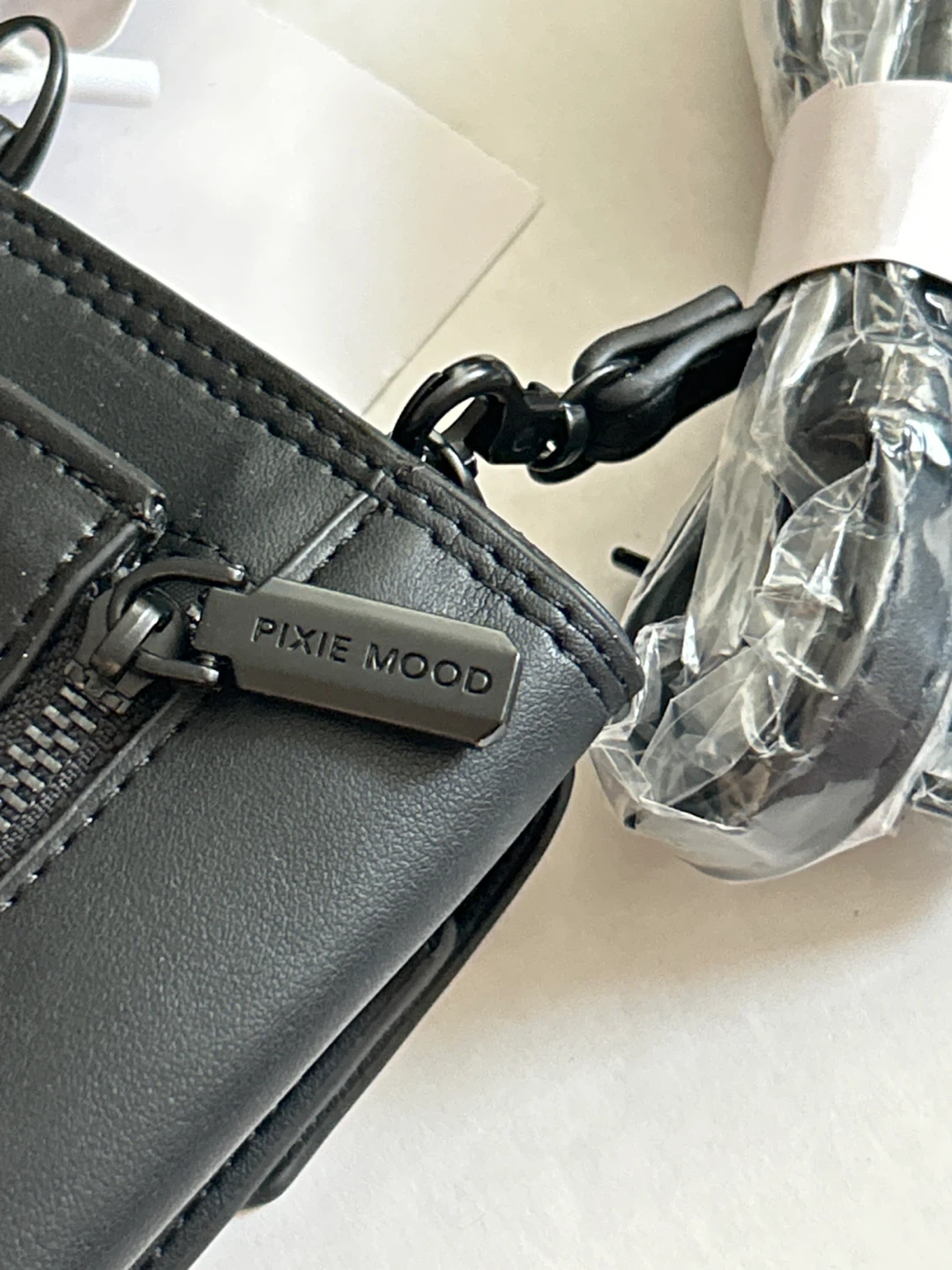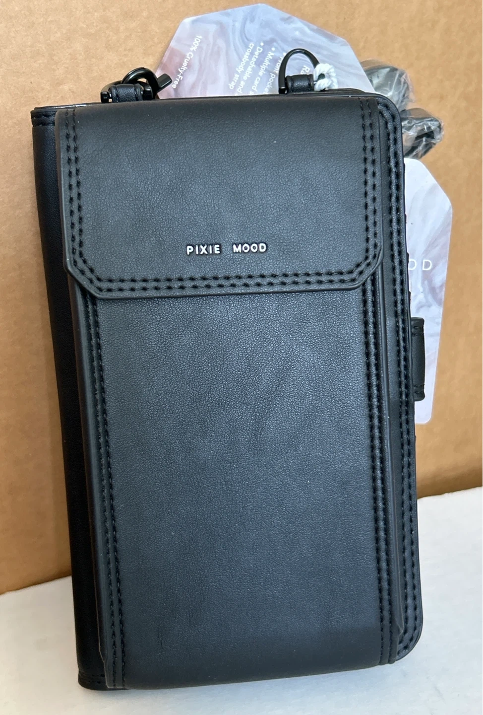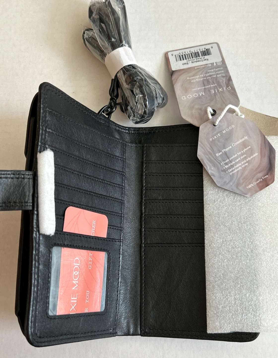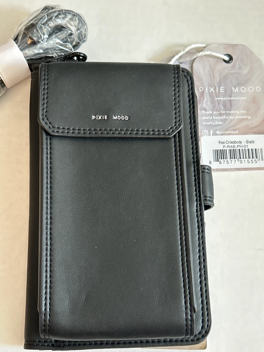 Selling a brand new black Pixie Mood Rae phone crossbody bag. It's made with vegan materials and features multiple card slots and a front pocket for a phone. It includes a detachable and adjustable crossbody strap.