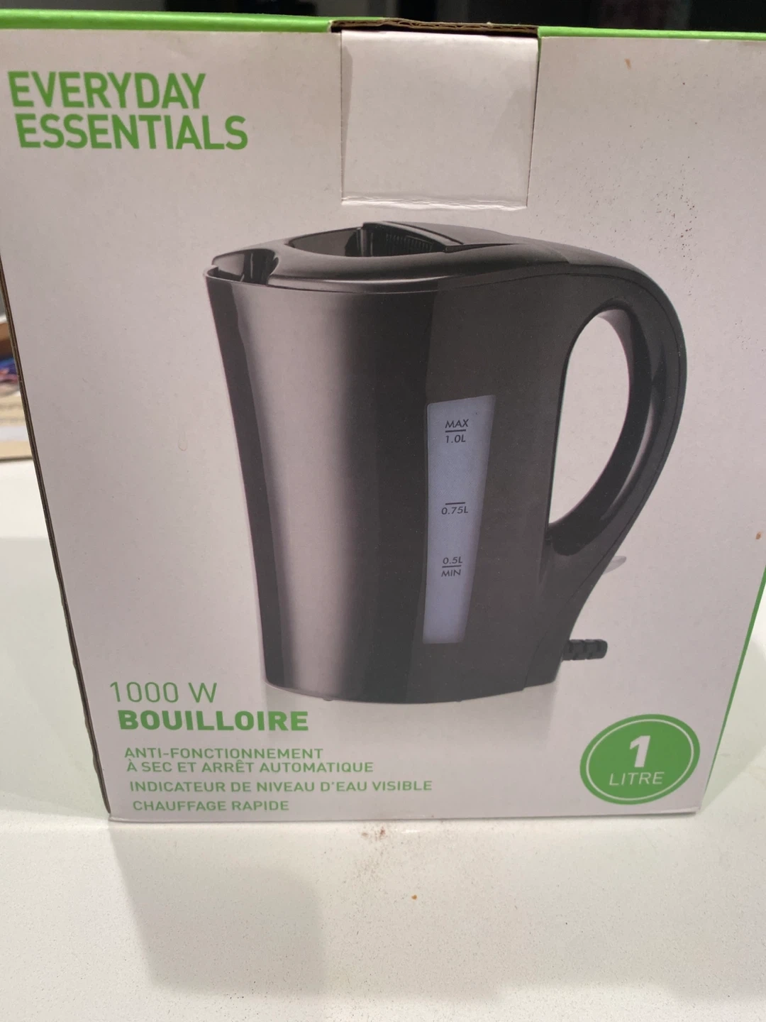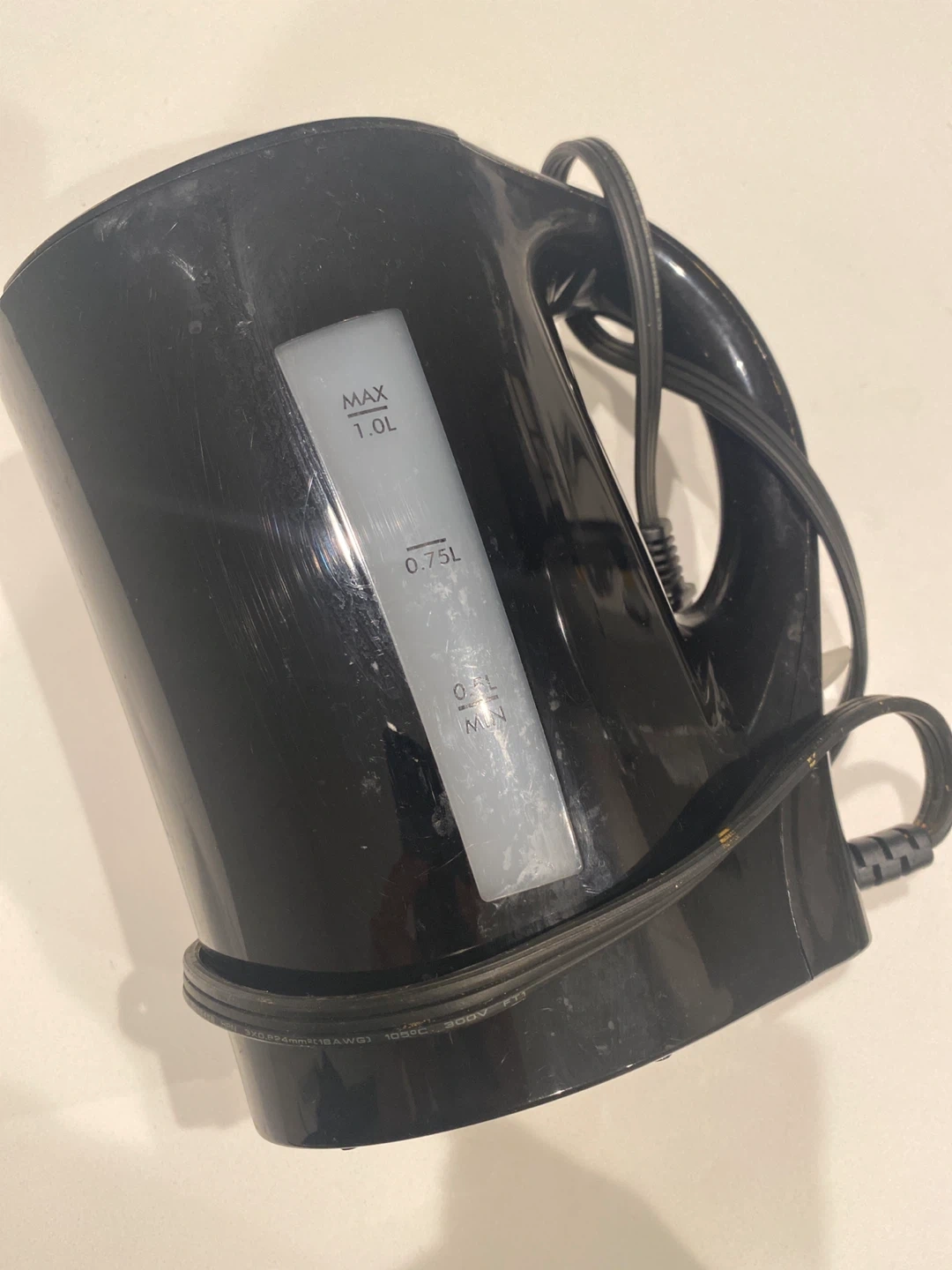 This black electric kettle has a 1.0L maximum capacity. Power cord is included. Comes with original box
