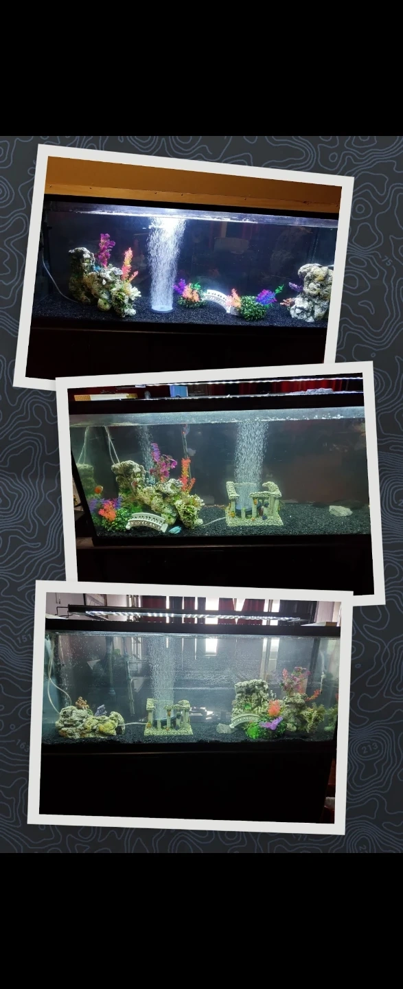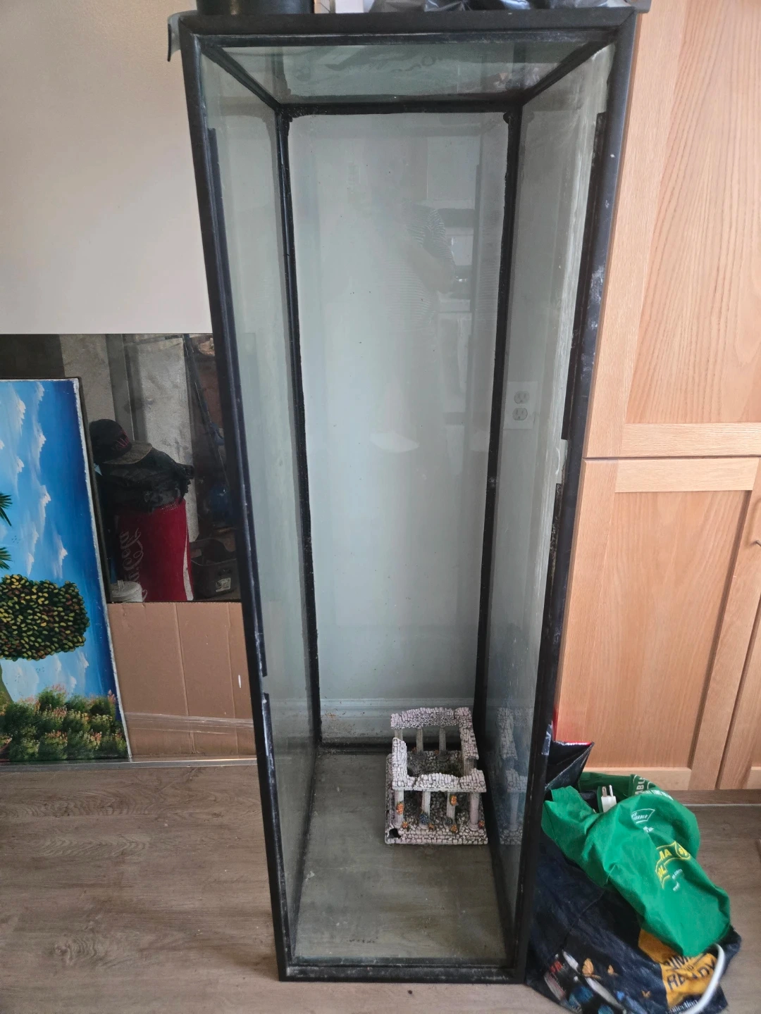 This is a large 120 g glass aquarium tank. It's made of glass with black trim. Comes with a decorative castle and they have more little items i don't have the space anymore ... that's all