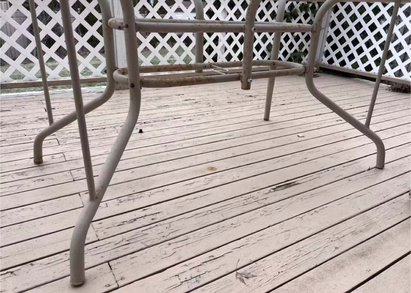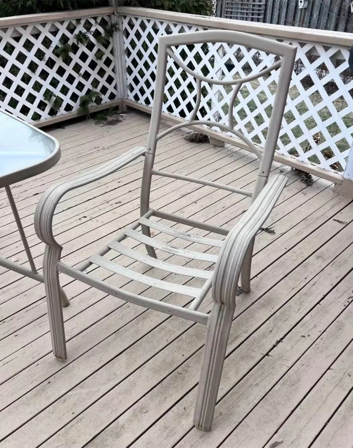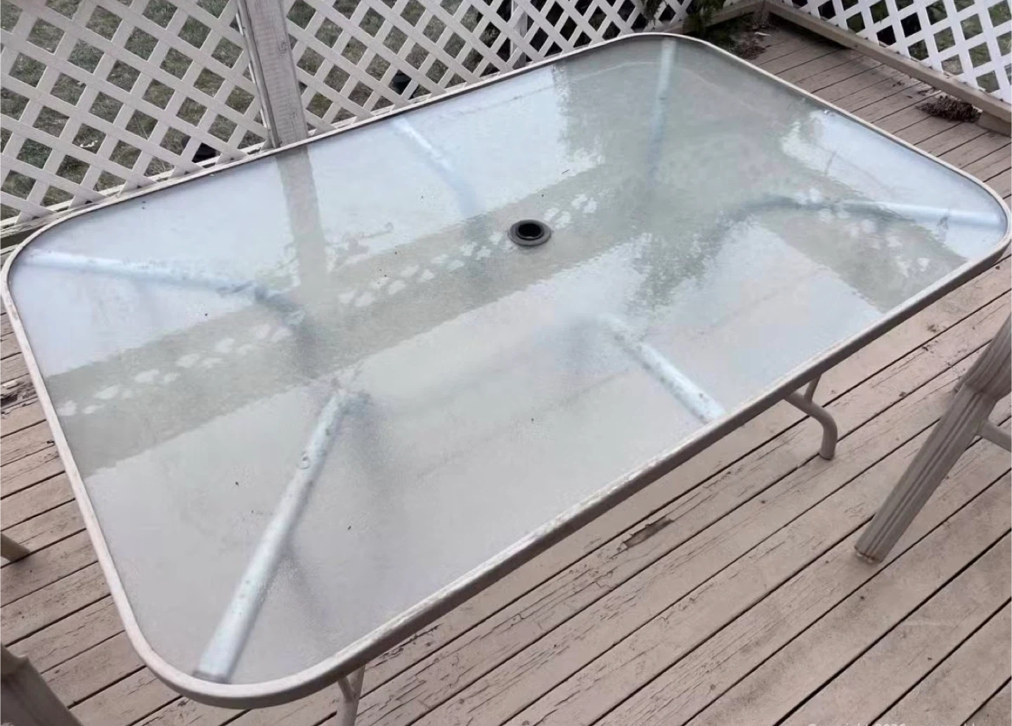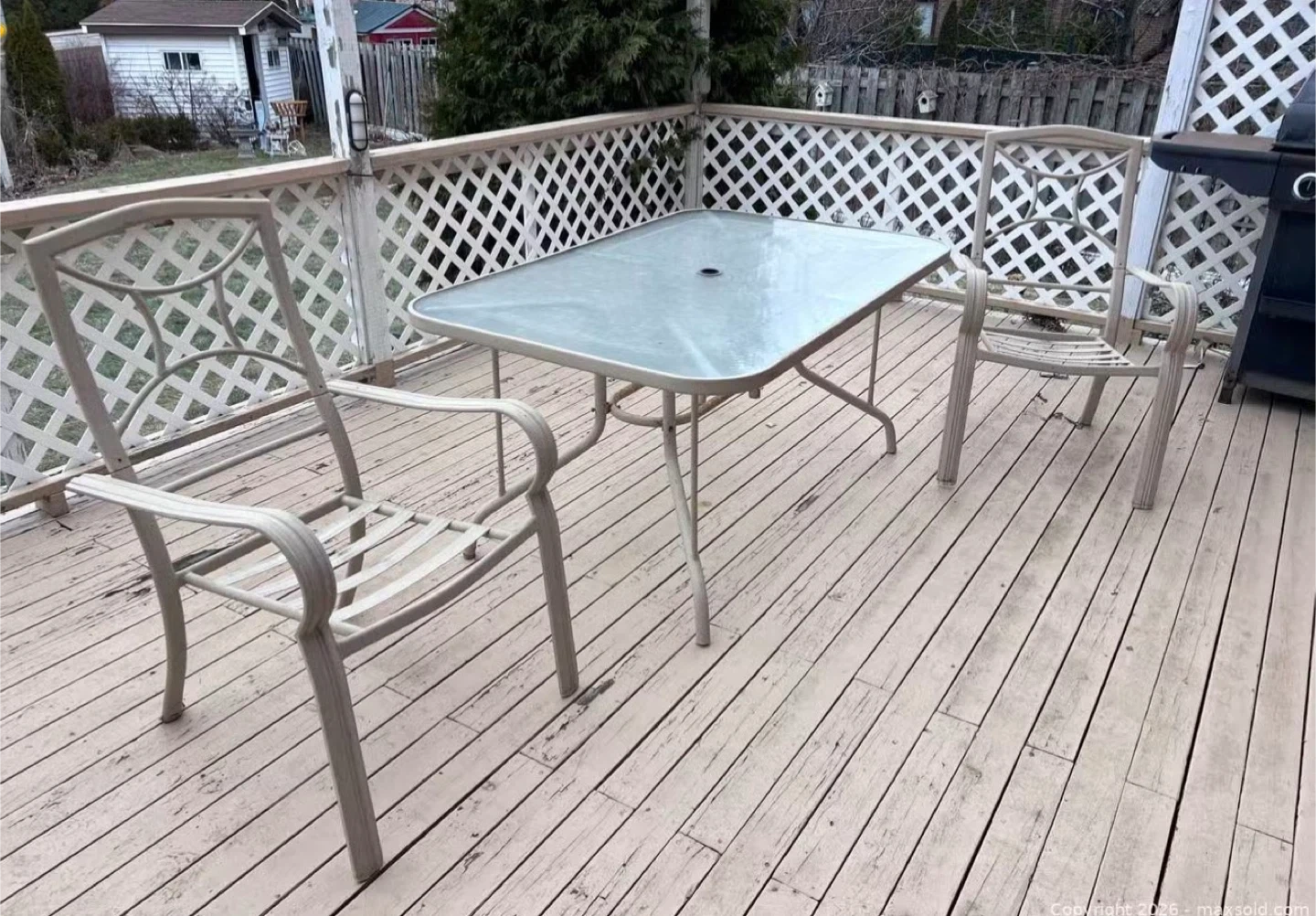 Outdoor dining set with a rectangular glass-top table and two matching chairs. Table has a metal frame with a glass surface. Chairs are also metal with a slat-style seat and back. Great for your deck or patio!