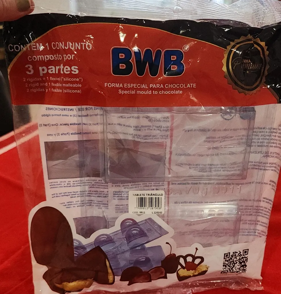 I'm selling a BWB special mould for chocolate. This is a triangle tablet mold, perfect for making unique chocolate treats. It contains 3 parts: 2 rigid and 1 flexible silicone. It's a great way to get creative with your confectionery!