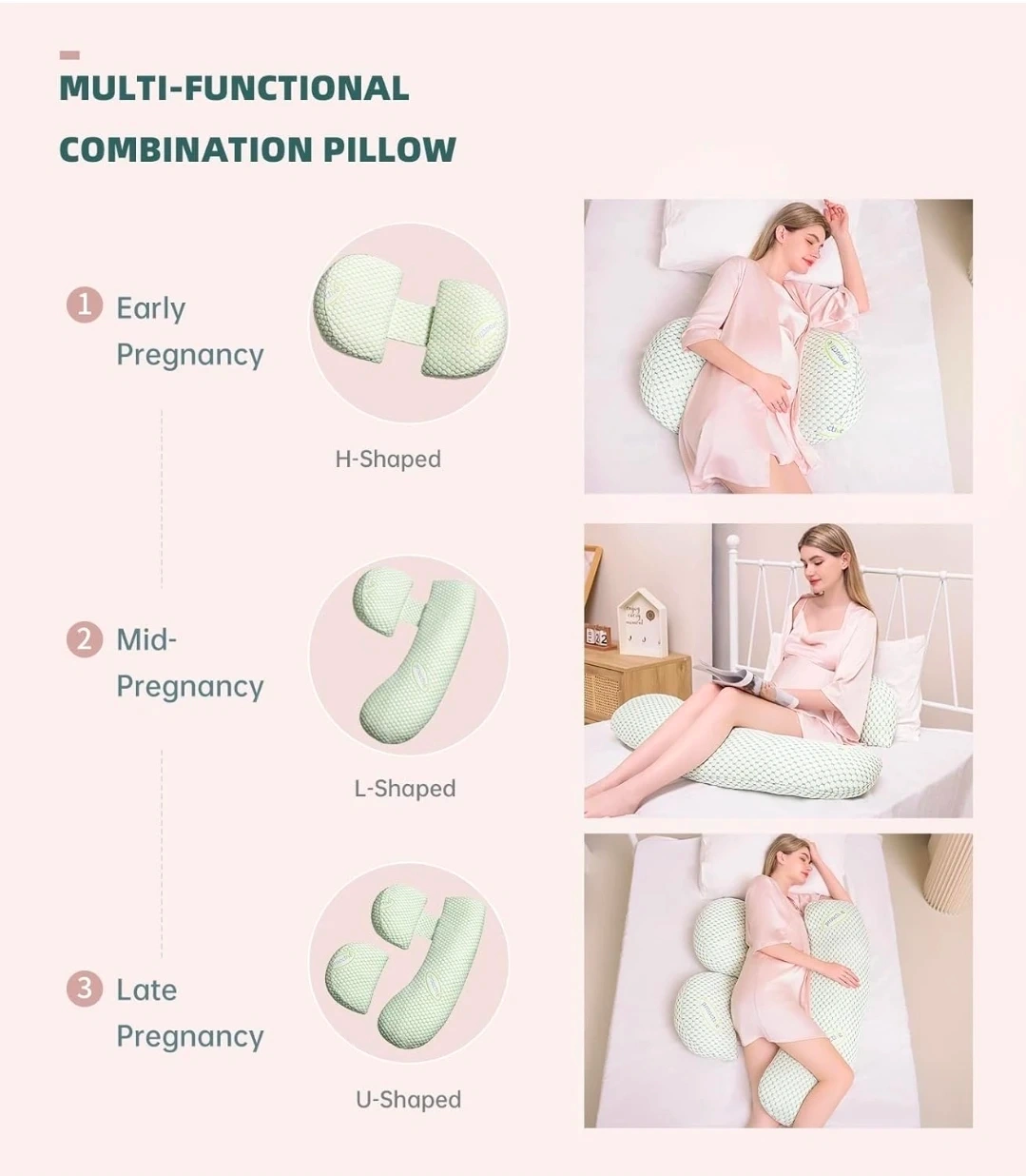 This multi-functional combination pillow offers full body support. It's designed to relieve pressure and pain in different areas, supporting the abdomen, waist, and legs. The pillow can be adjusted into H, L, and U shapes for early, mid, and late pregnancy stages.