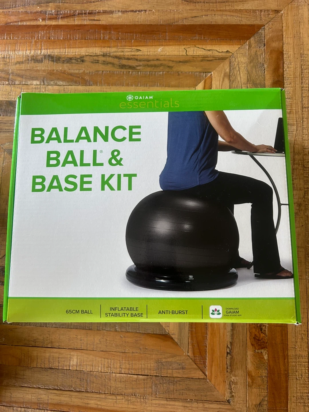 NEW. This is the Gaiam Essentials Balance Ball & Base Kit. It includes a 65cm anti-burst balance ball and a stability base. The ball is inflatable.