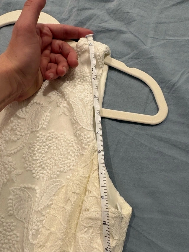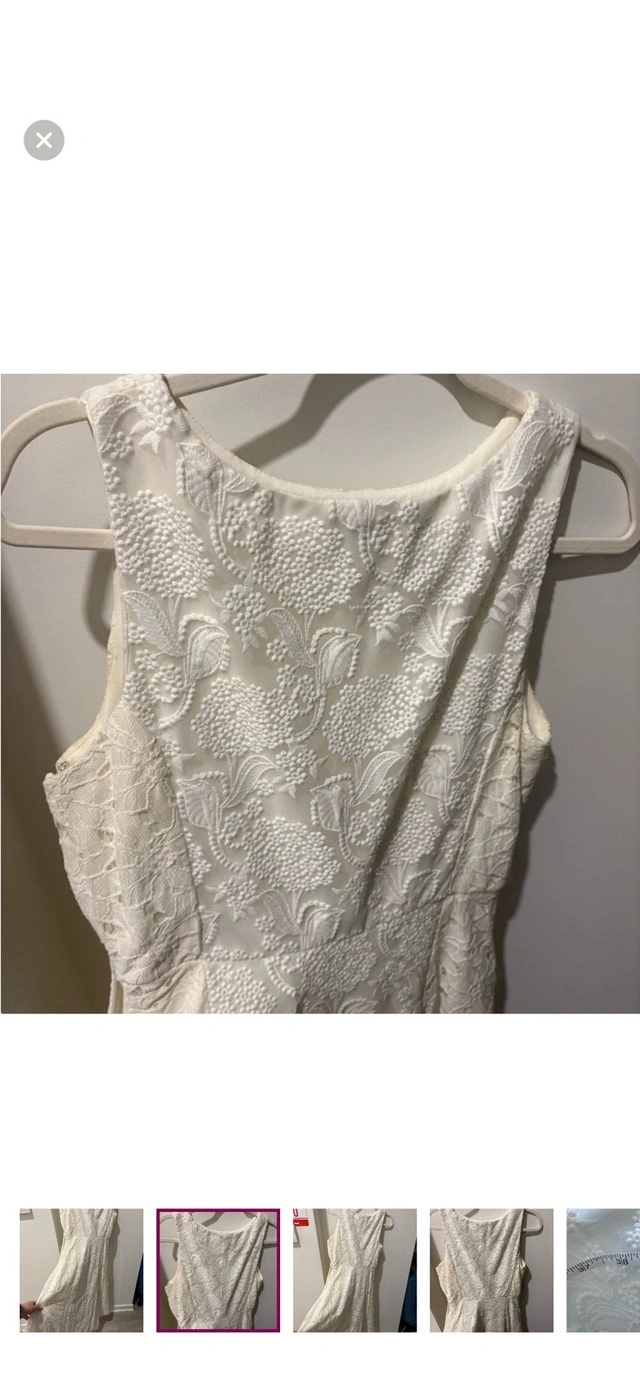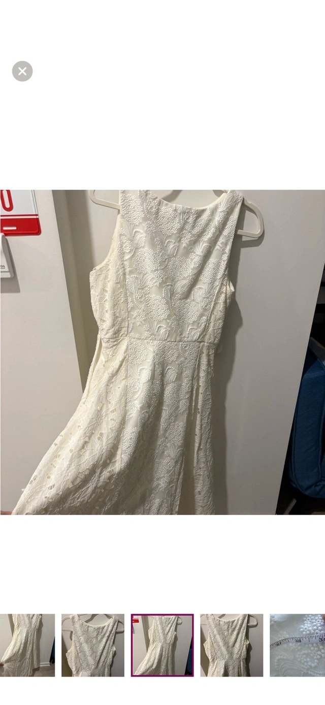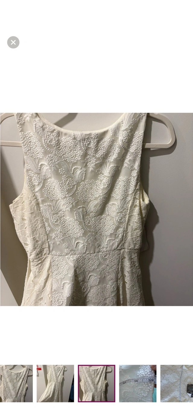 This is a beautiful white dress that has been gently used. The dress measures 38 inches in length, offering a lovely fit and style. It’s perfect for any special occasion or a chic everyday look. Length: 38 inches. If the ad is up, the dress is available!
