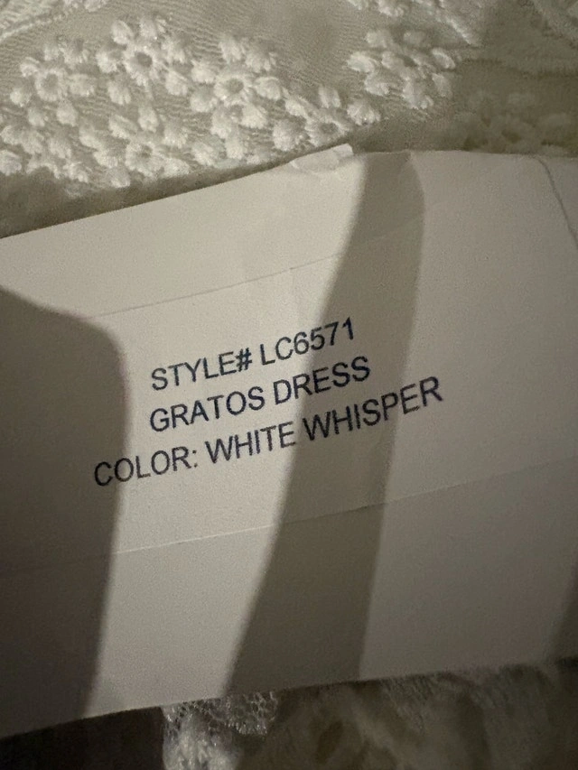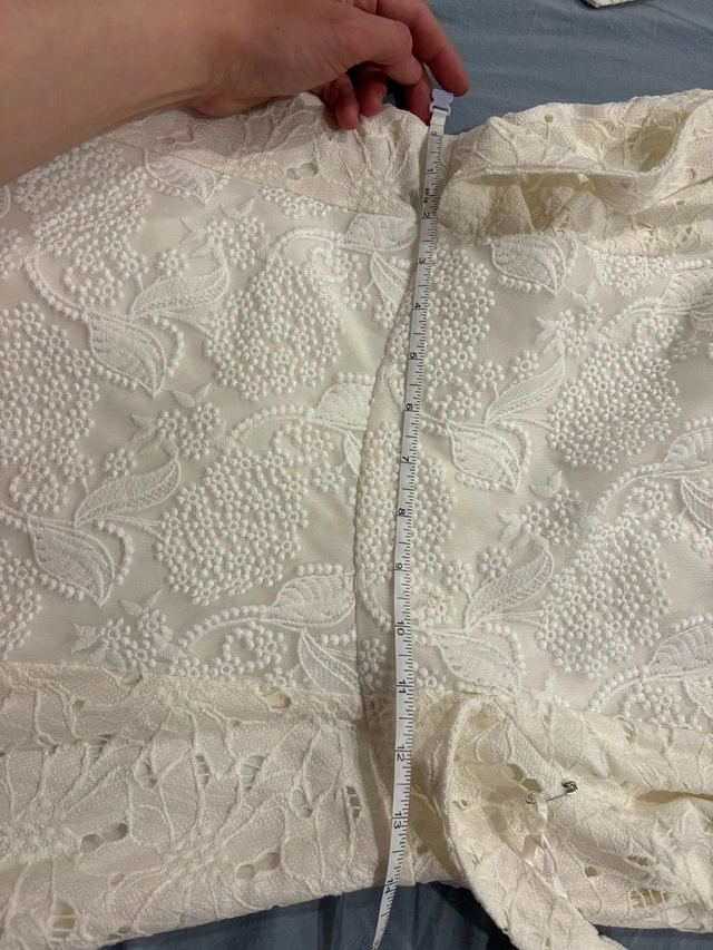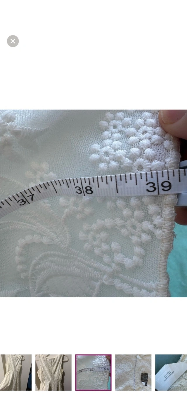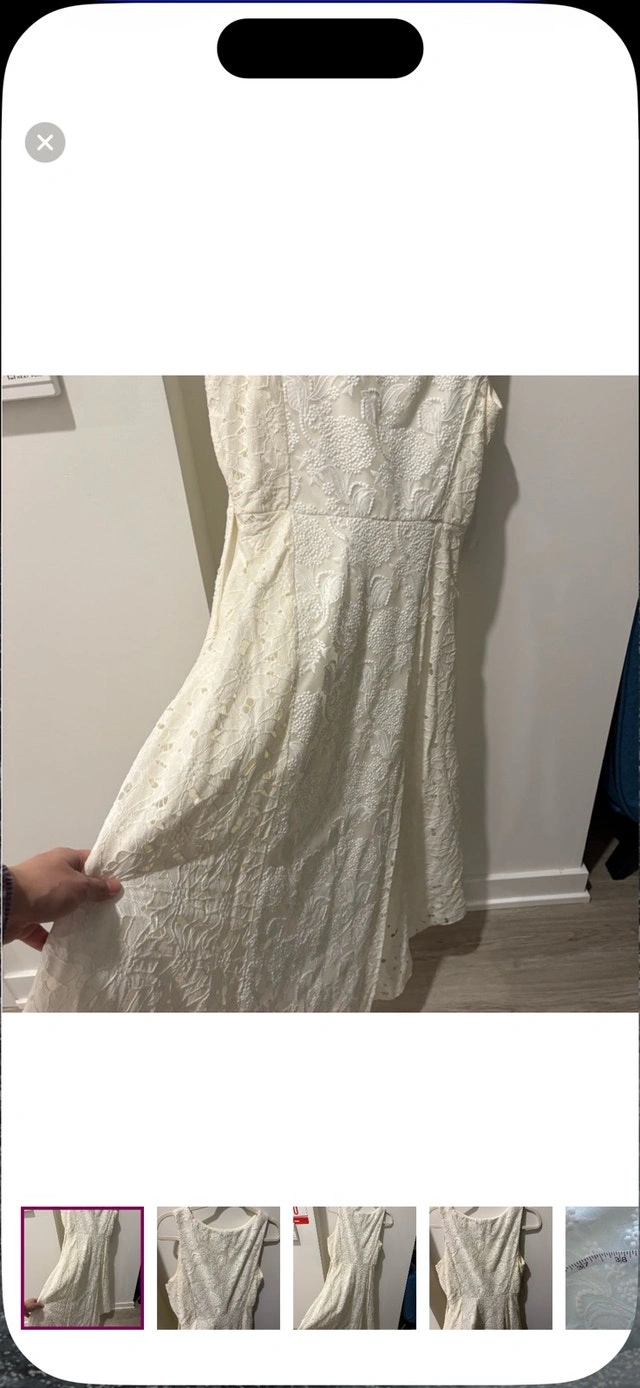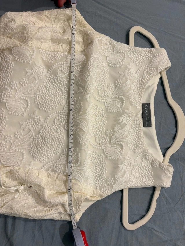 This is a beautiful white dress that has been gently used. The dress measures 38 inches in length, offering a lovely fit and style. It’s perfect for any special occasion or a chic everyday look. Length: 38 inches. If the ad is up, the dress is available!