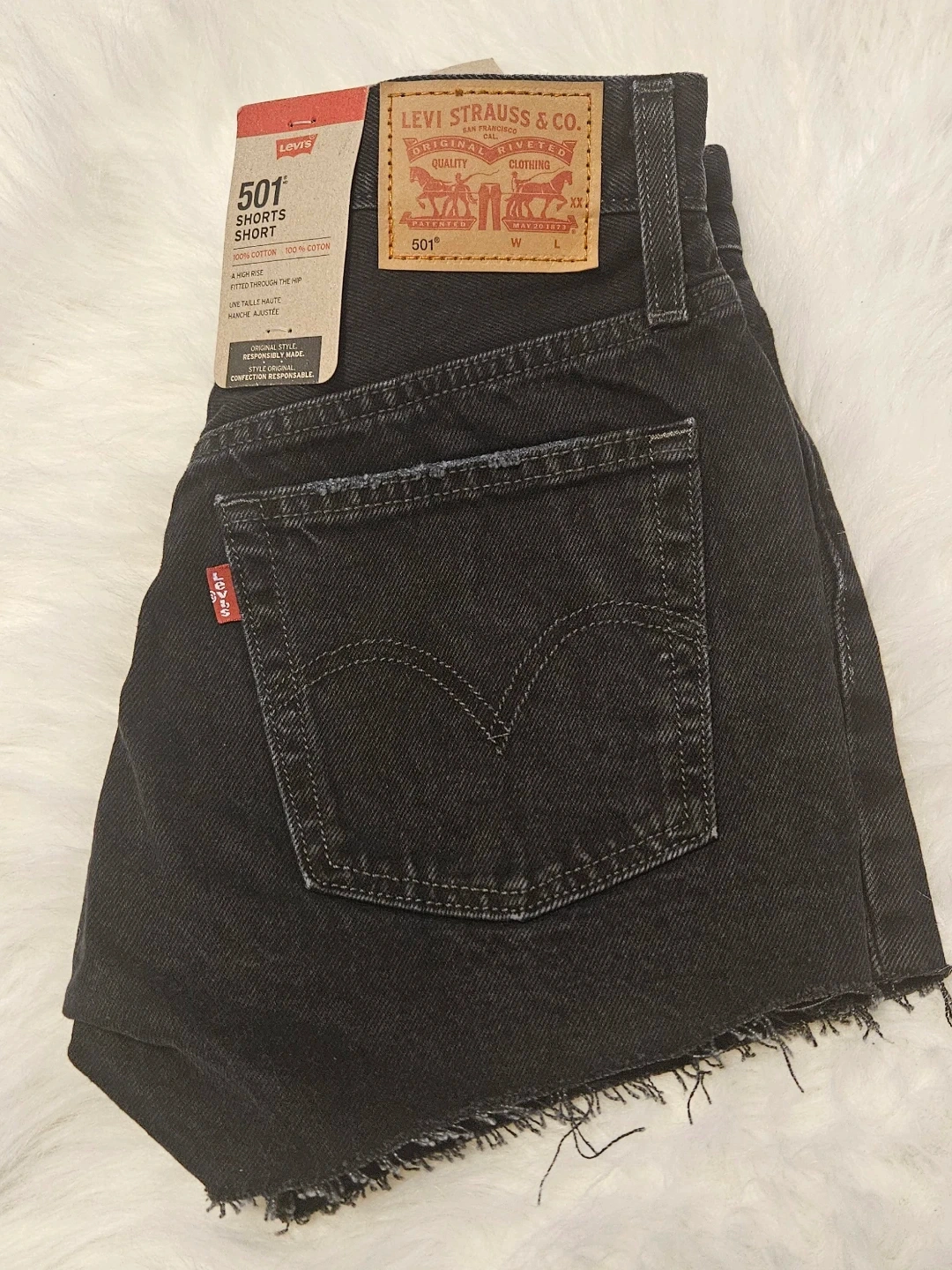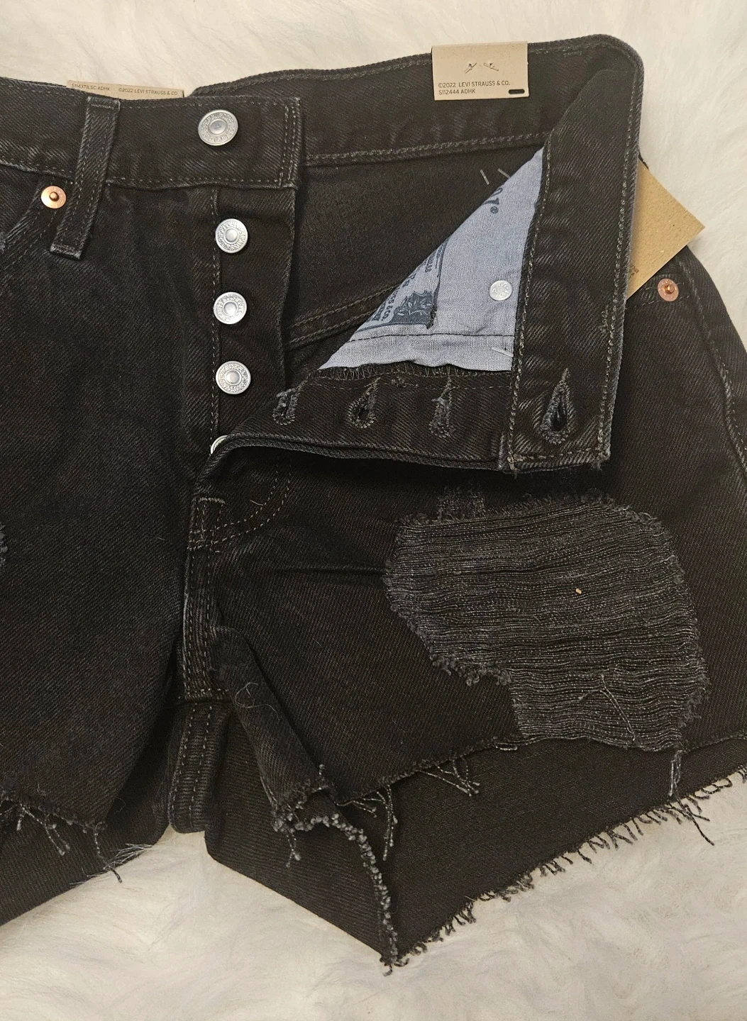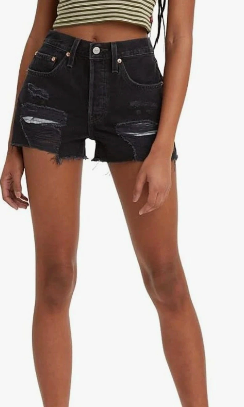 These are Levi's 501 black denim shorts with a distressed look. They feature a button-fly closure and frayed hem. Denim material.