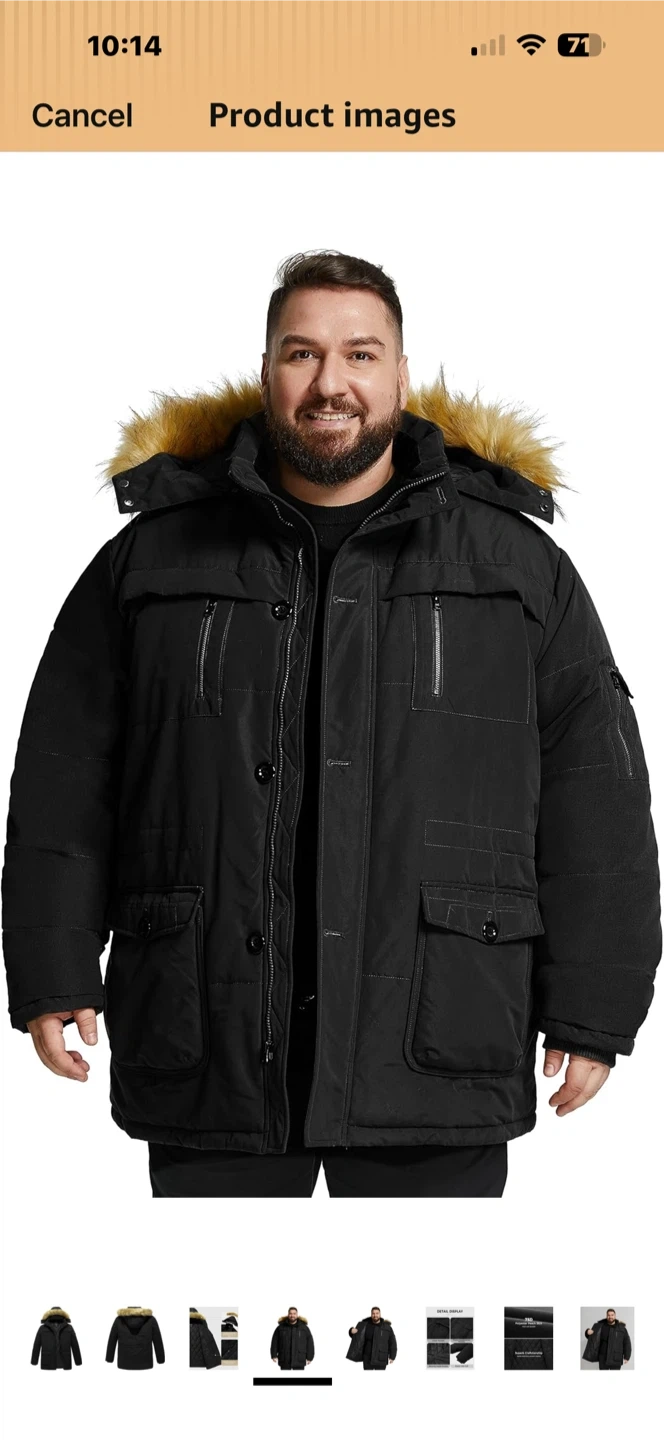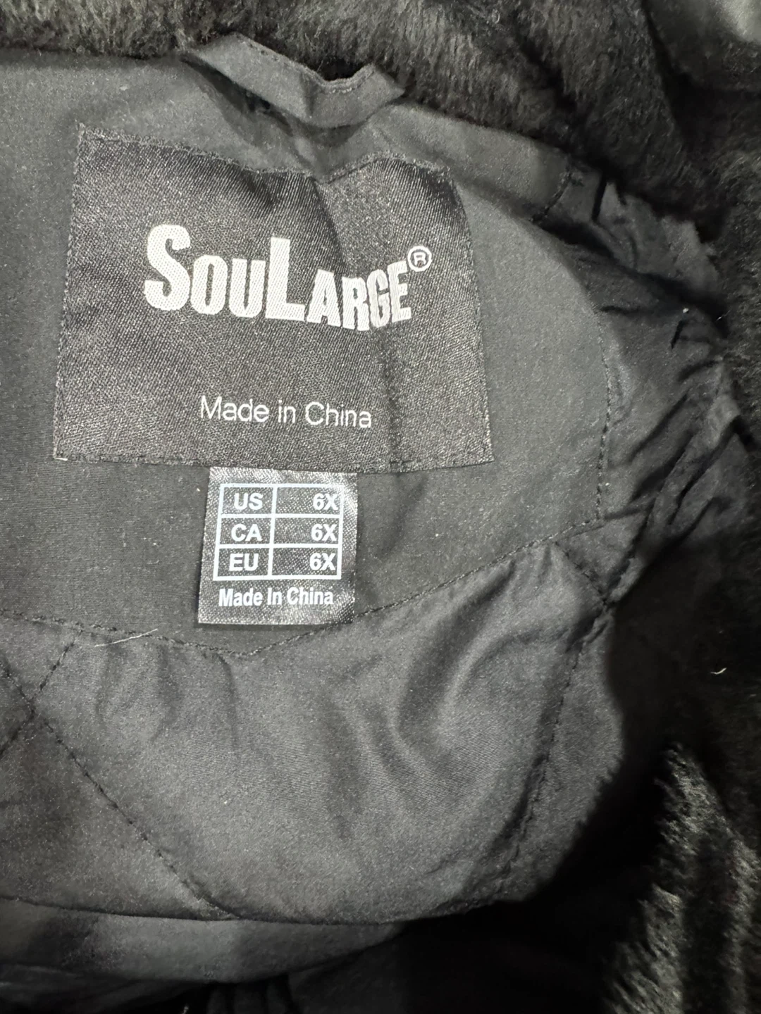 SoulLarge men's black winter parka jacket in size 6X. It features a quilted hood with a detachable faux fur trim and a double closure for added warmth. This parka is designed for cold weather.