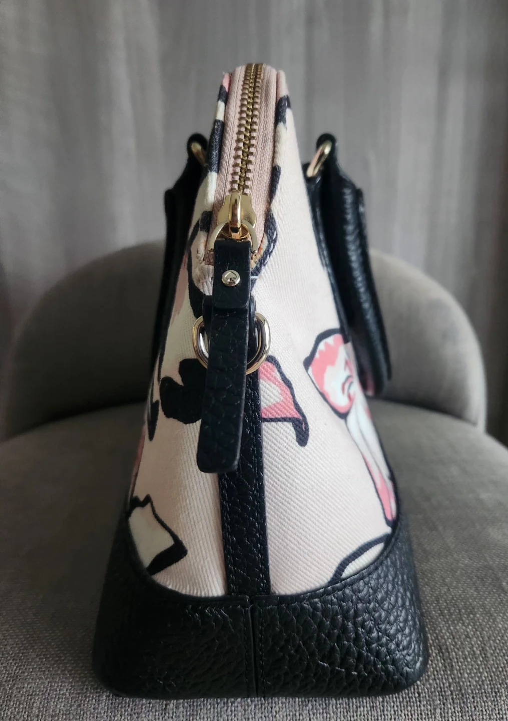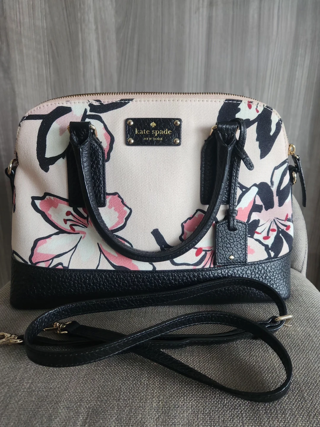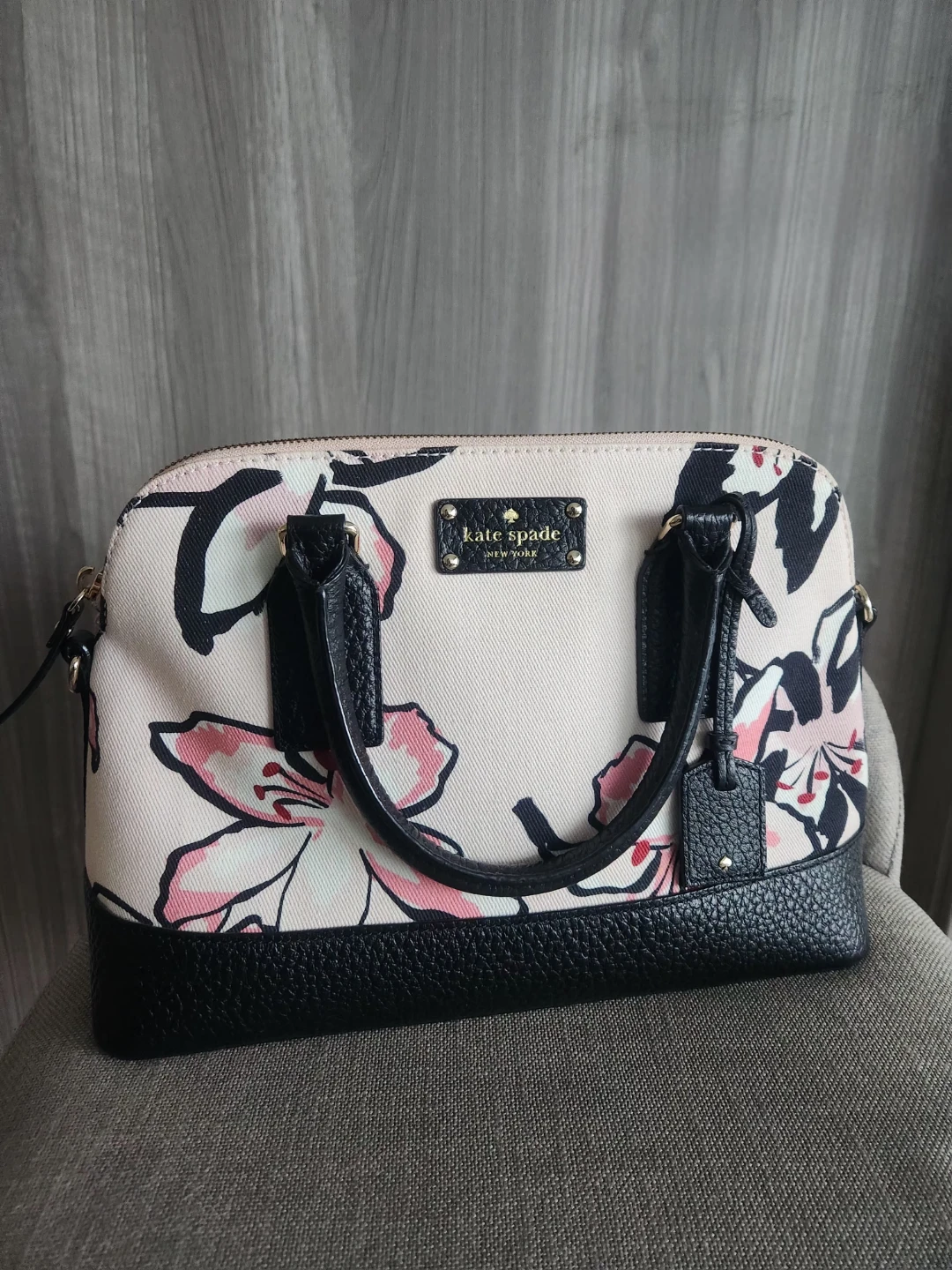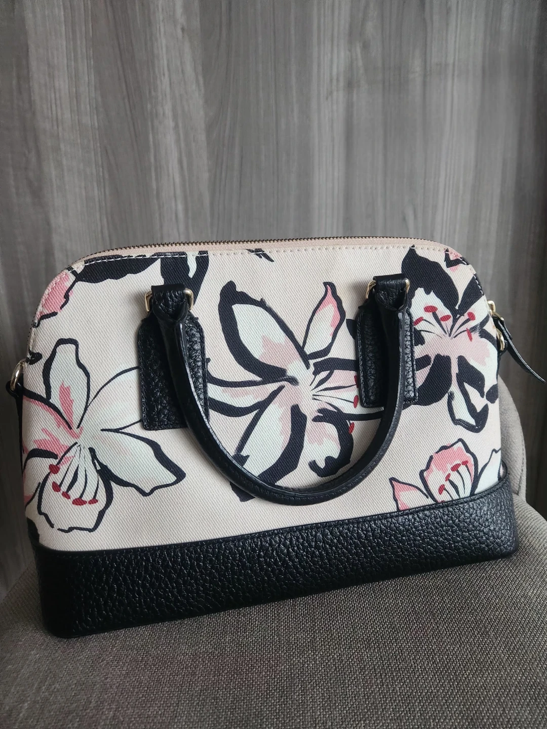 Here's a lovely LIKE-NEW Kate Spade dome satchel (tags removed, but never used)! It features a beautiful floral pattern on a light pink background with black leather trim. It also comes with a detachable shoulder strap for versatility. Perfect as a holiday gifting or for adding a touch of elegance to any outfit!