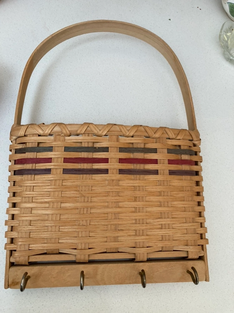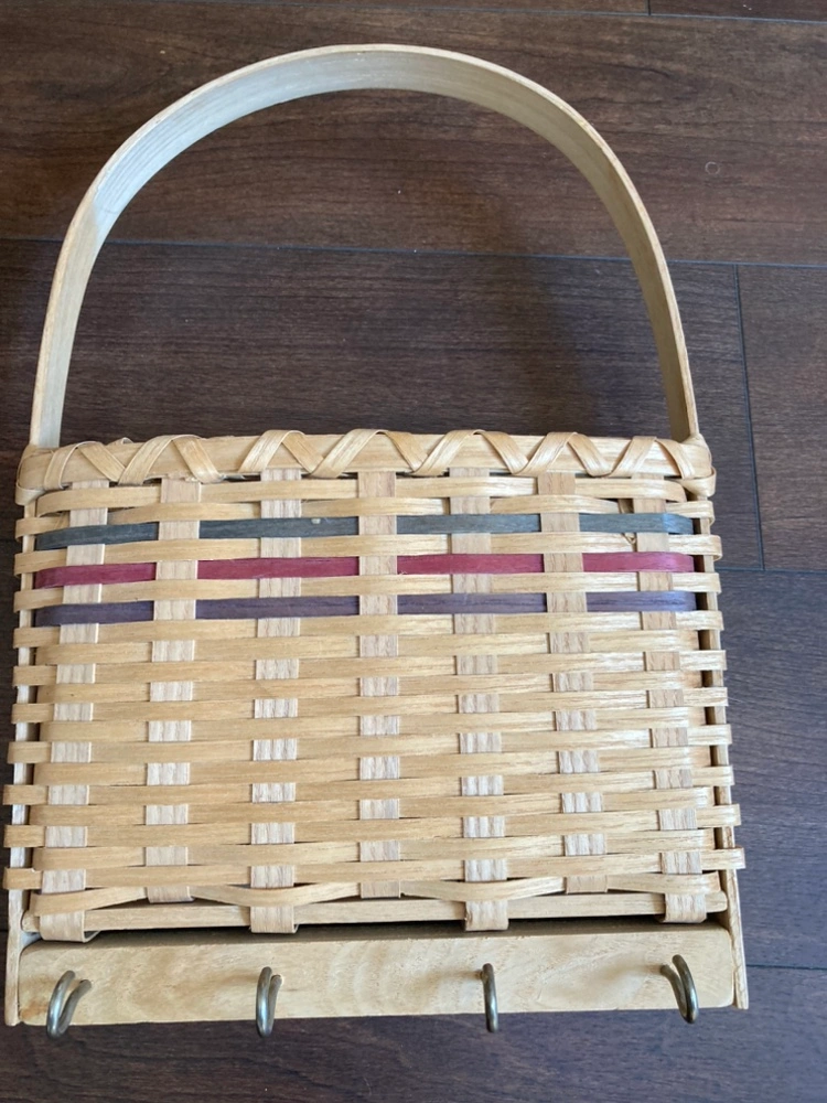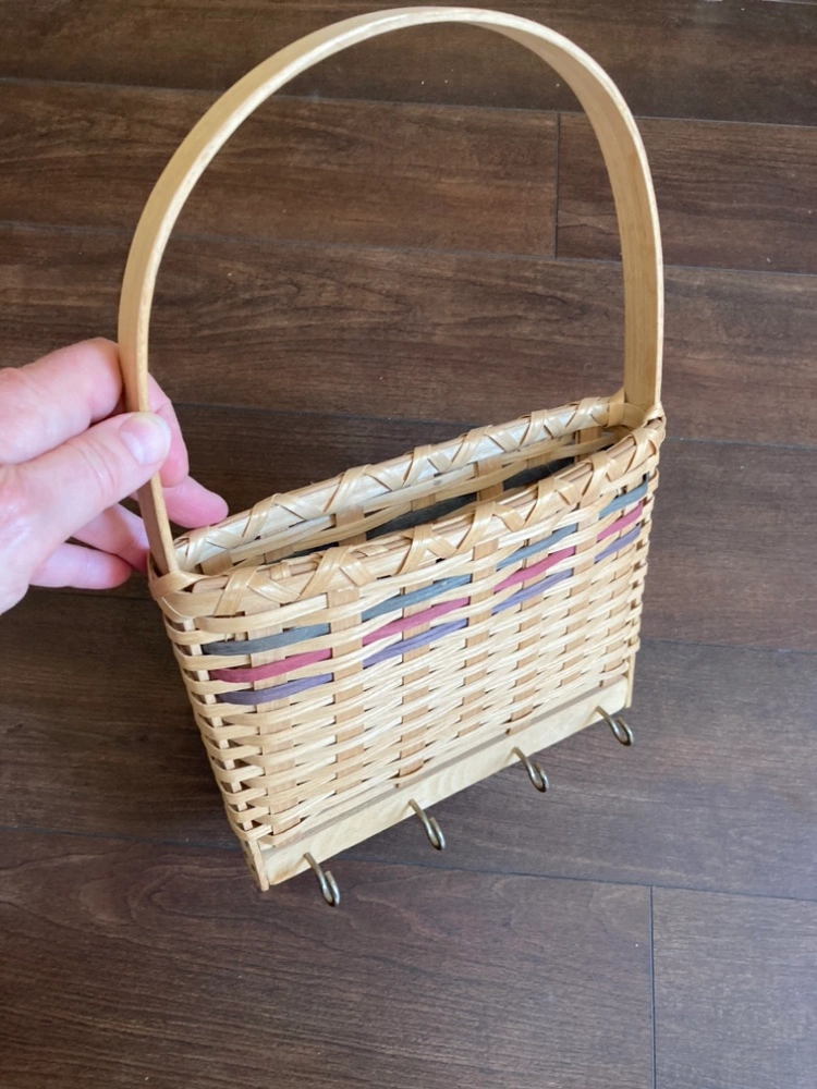Handwoven wicker wall basket with four metal hooks. Perfect for organizing mail, keys, or other small items.