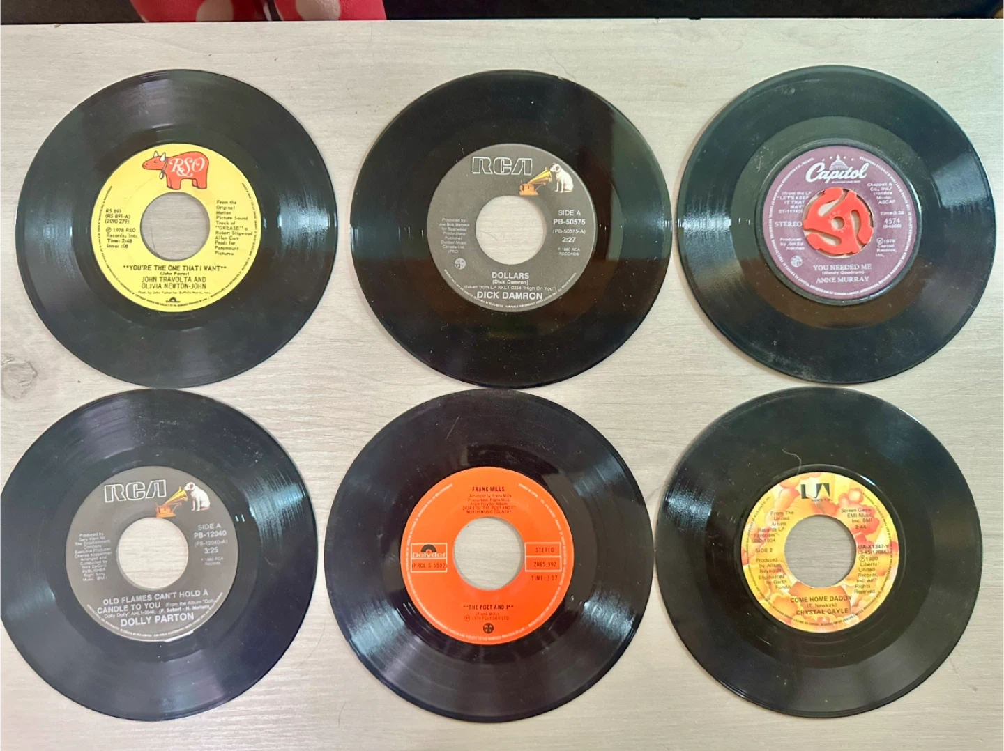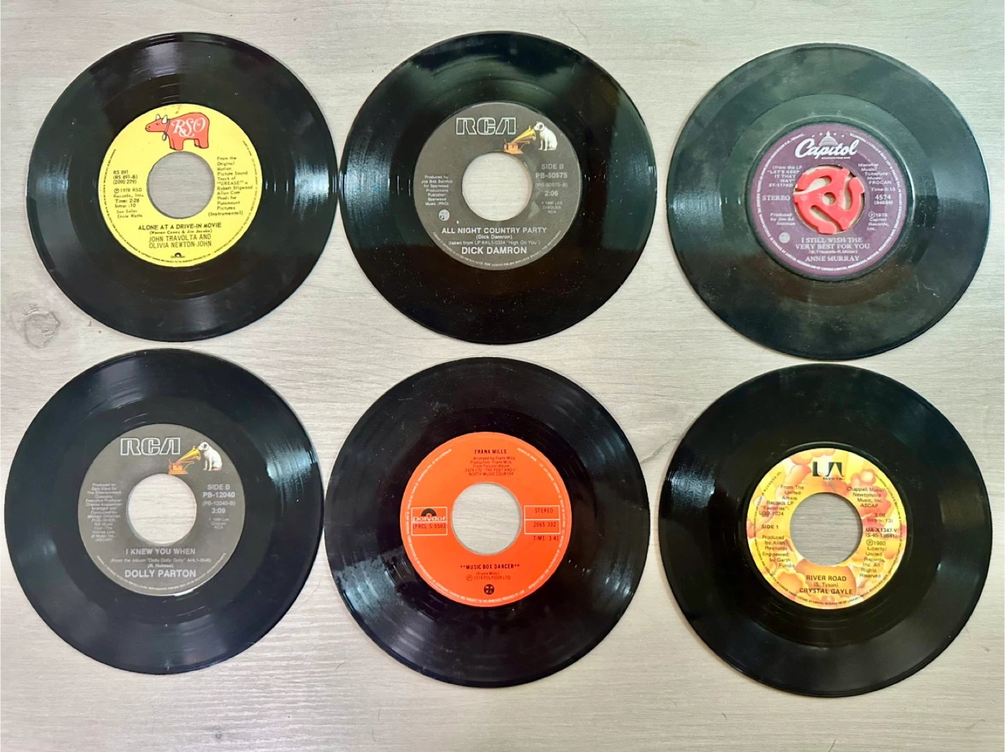 Collection of 15 assorted 7-inch vinyl records. Features artists like Dolly Parton, John Travolta, Olivia Newton-John, and more. These are standard 45 RPM records.will not sell separately must take all