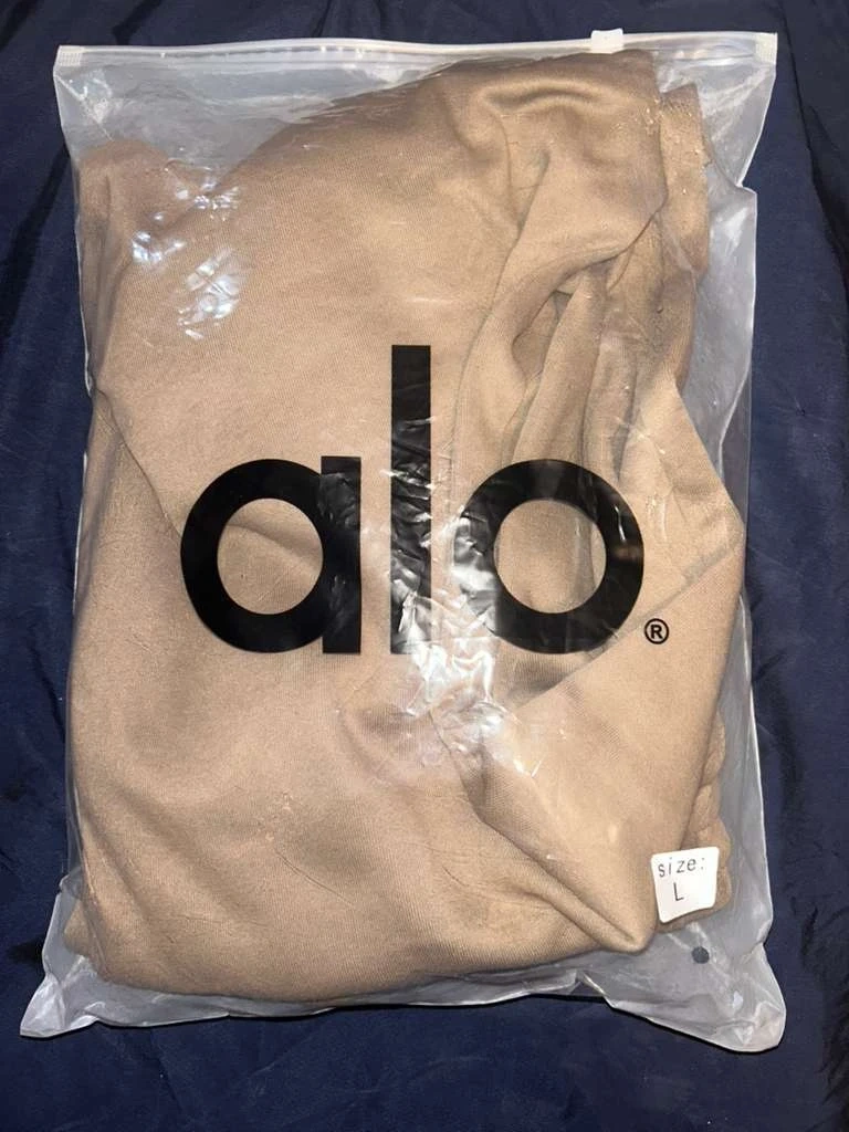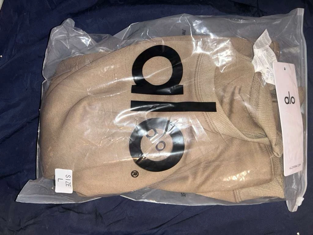 This is a tan Alo Yoga sweatshirt and pants in size large. It's packaged in its original plastic bag. The material appears to be soft and comfortable. It's a staple for casual wear!