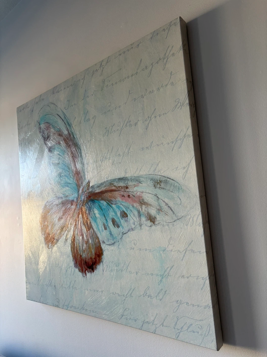 Decorative canvas with a butterfly design in blue tones. The background has handwritten-style text, giving it a modern look.