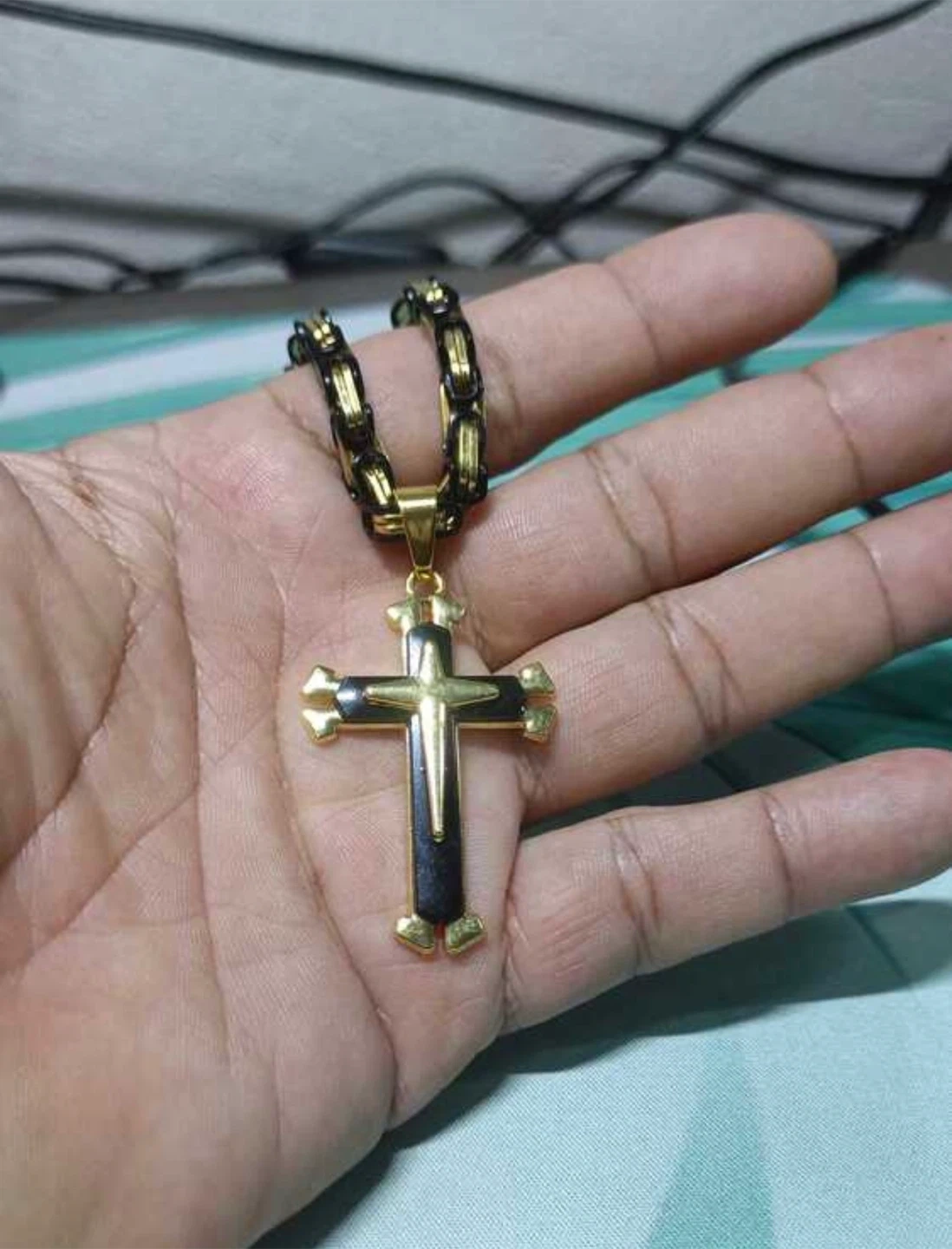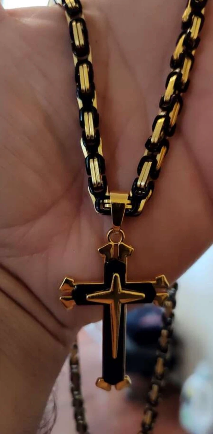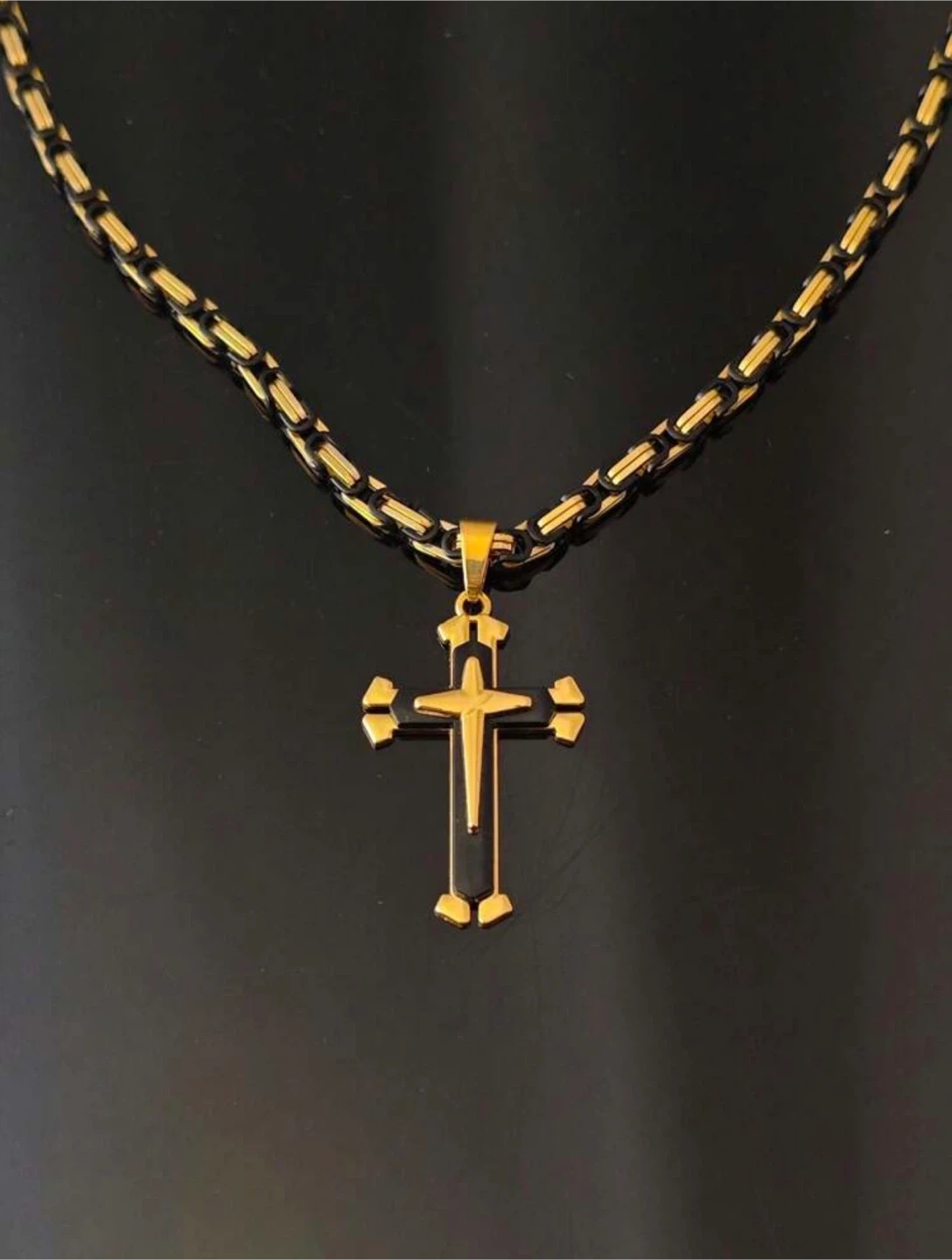 This necklace features a striking cross pendant with a two-tone gold and black design. It's paired with a sturdy, complementary chain. Makes a great statement piece!