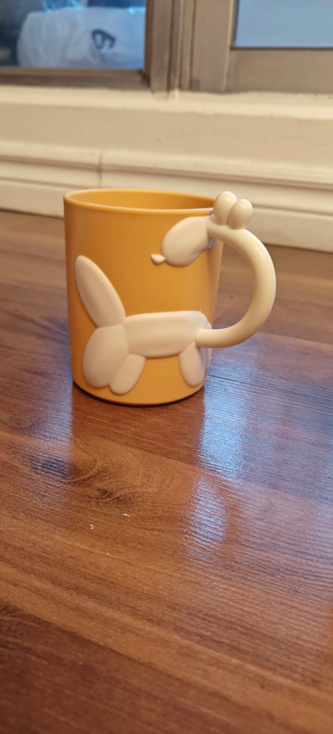 Selling a couple of cute novelty mugs. One is a yellow mug with a balloon dog handle. The other is a cat-themed mug with lots of different cats on it