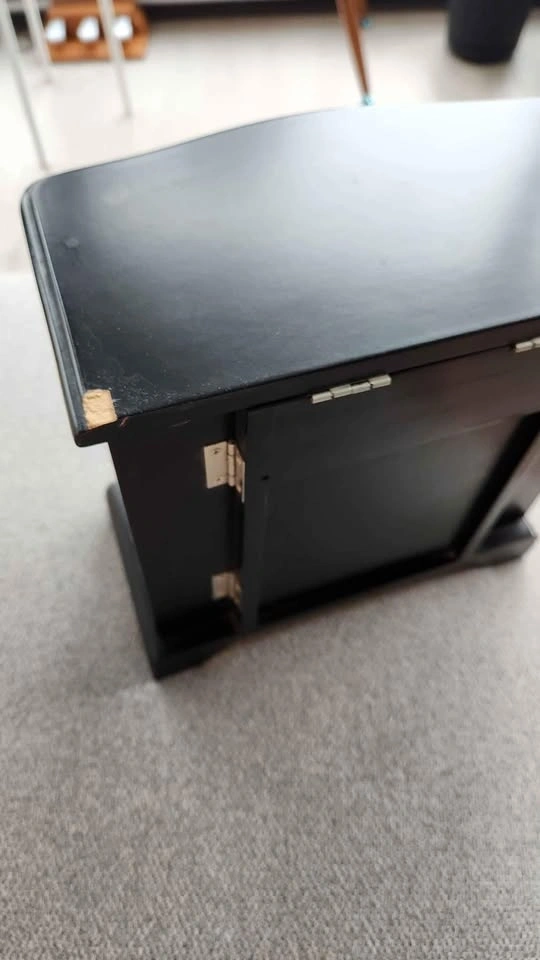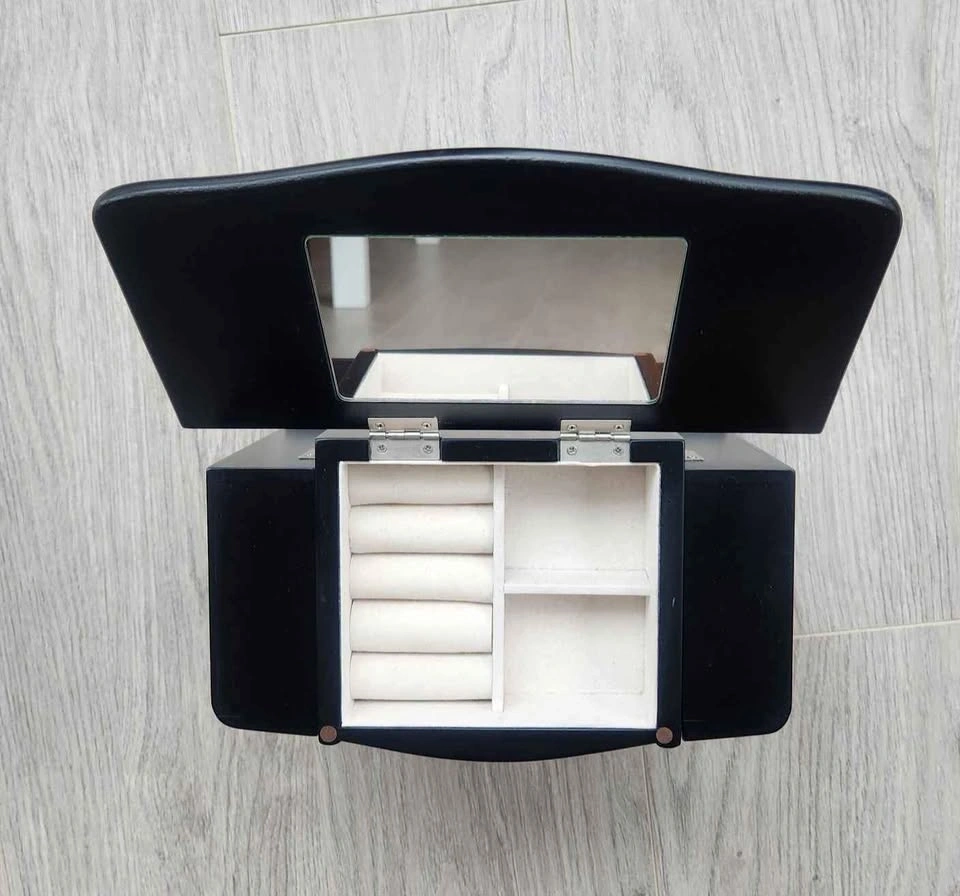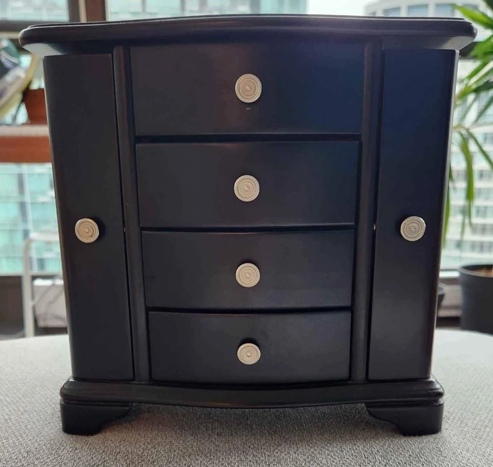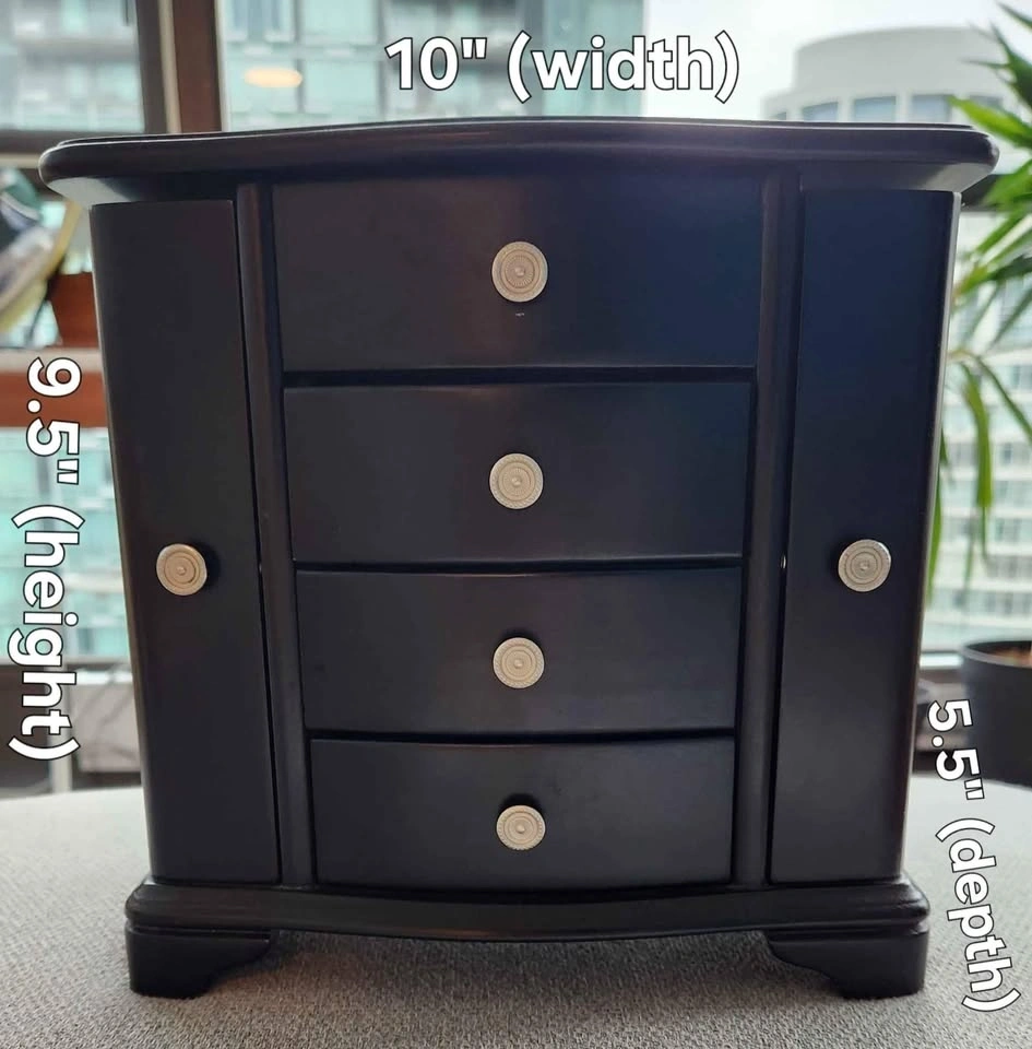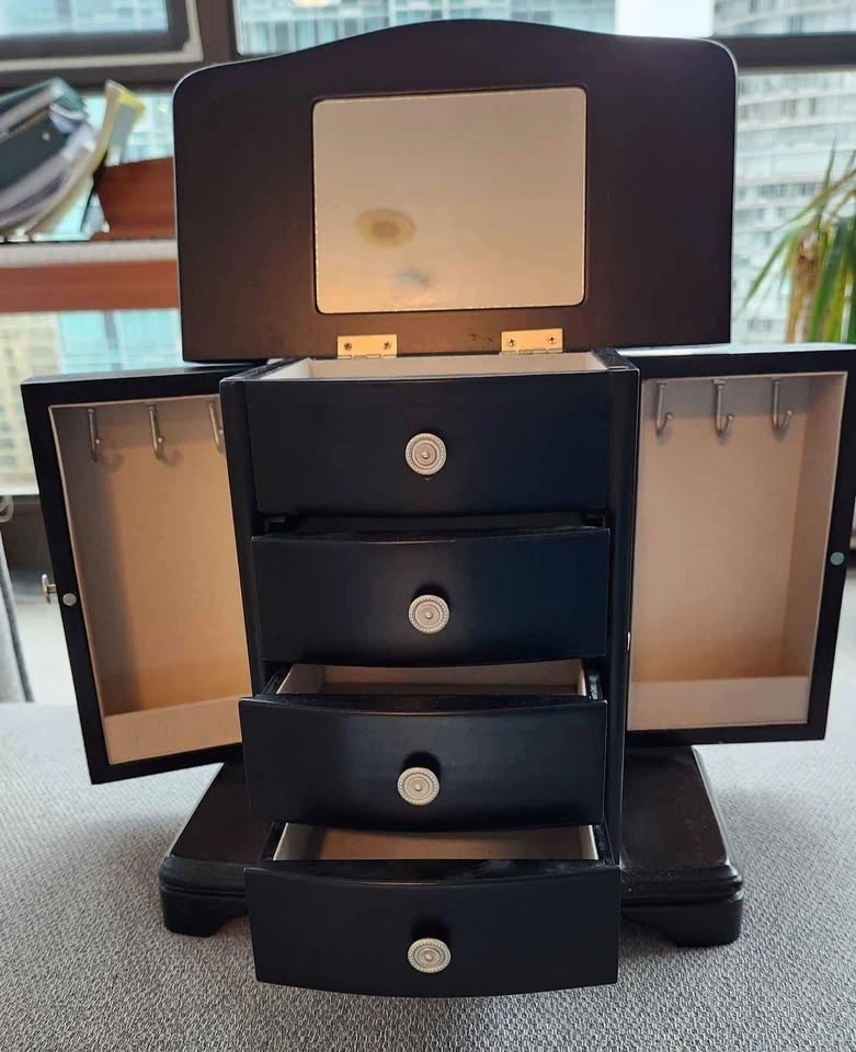 Wooden jewelry box with dual necklace doors, an interior mirror, and three open drawers for storage. There's a chip in the back corner as shown in the photo. Dimensions: 10" wide x 9.5" tall x 5.5" deep. Pick up only in Downtown.