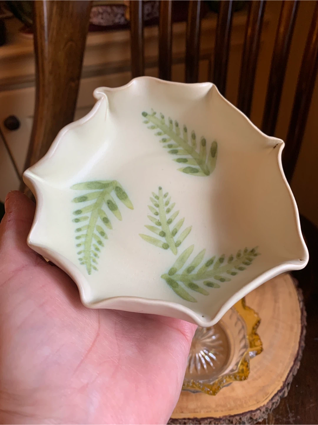 ~a ceramic dish with fern design
