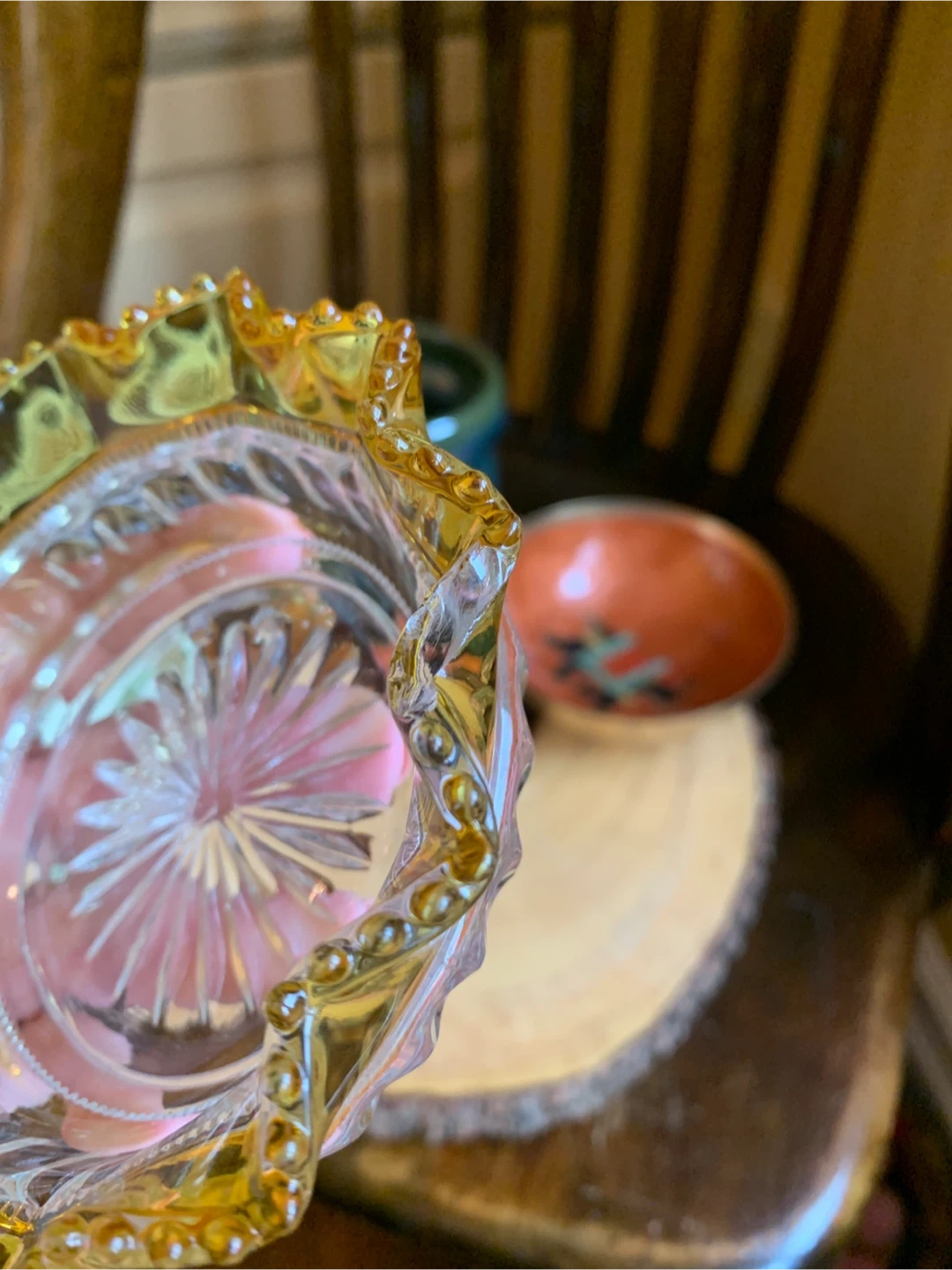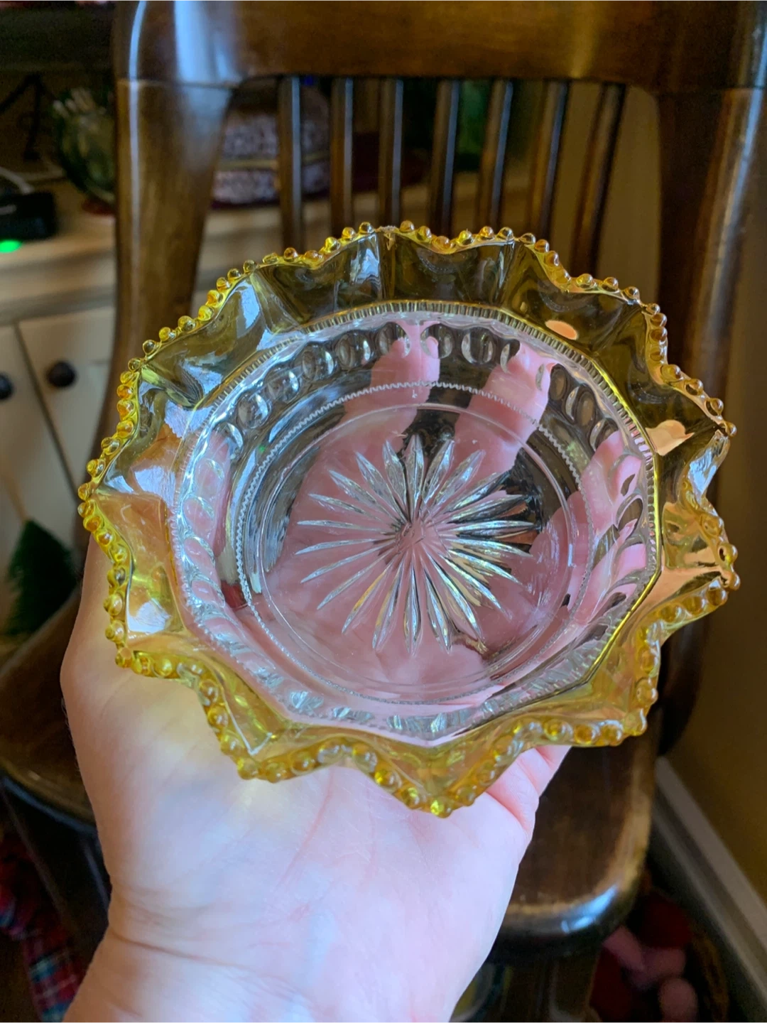 One disclaimer on yellow pressed glass dish as it has a small chip. (See pic)