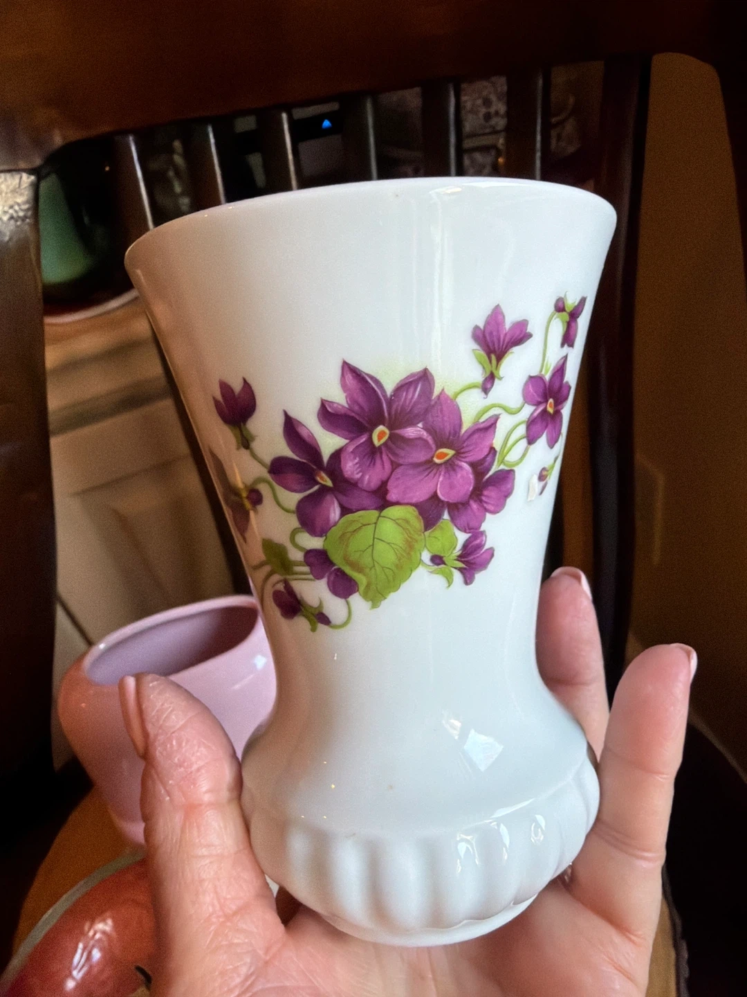 CHOICE 4~ PORCELAIN BUD VASE WITH PURPLE FLORAL DESIGN 5@ x 3.5” for $6