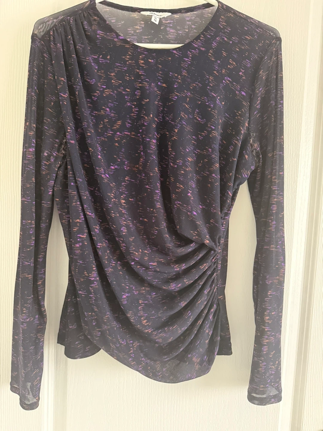 This top features a dark purple base with a scattered abstract print in purple and orange. It has long sleeves and a ruched side detail. Sheer mesh fabric throughout. Xl but fits like a large