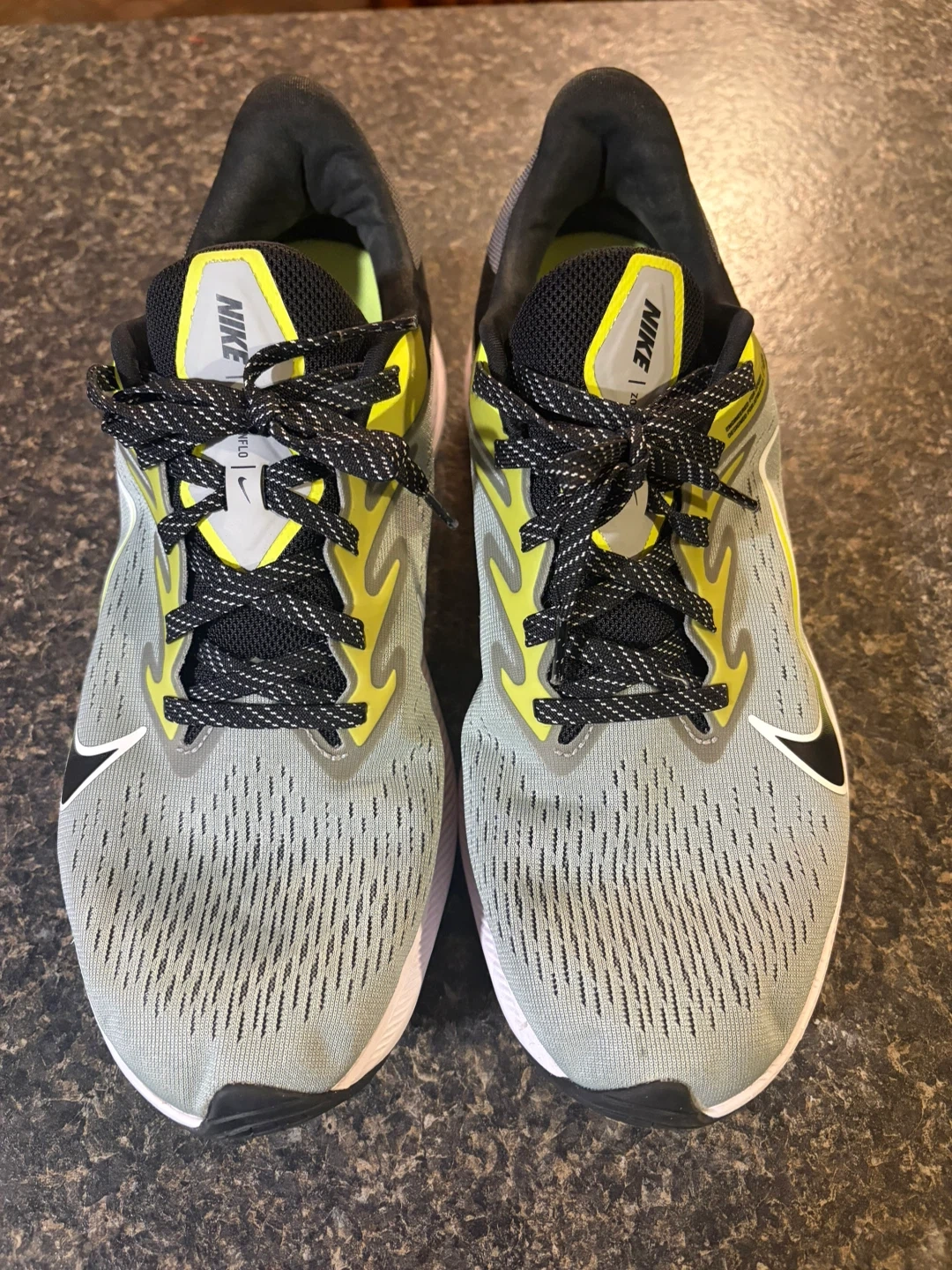 These Nike Zoom running shoes are designed for performance. They feature a lightweight, breathable mesh upper and a responsive cushioning system. The shoes are grey with neon yellow accents and black laces.