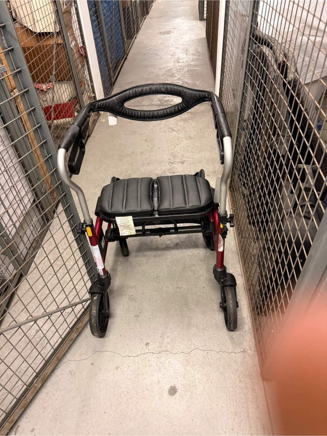 This is an Evolution brand rollator walker. It features a padded seat and a removable basket for storage. The frame is made of lightweight metal and has adjustable hand grips. It's designed to provide stability and support for walking.