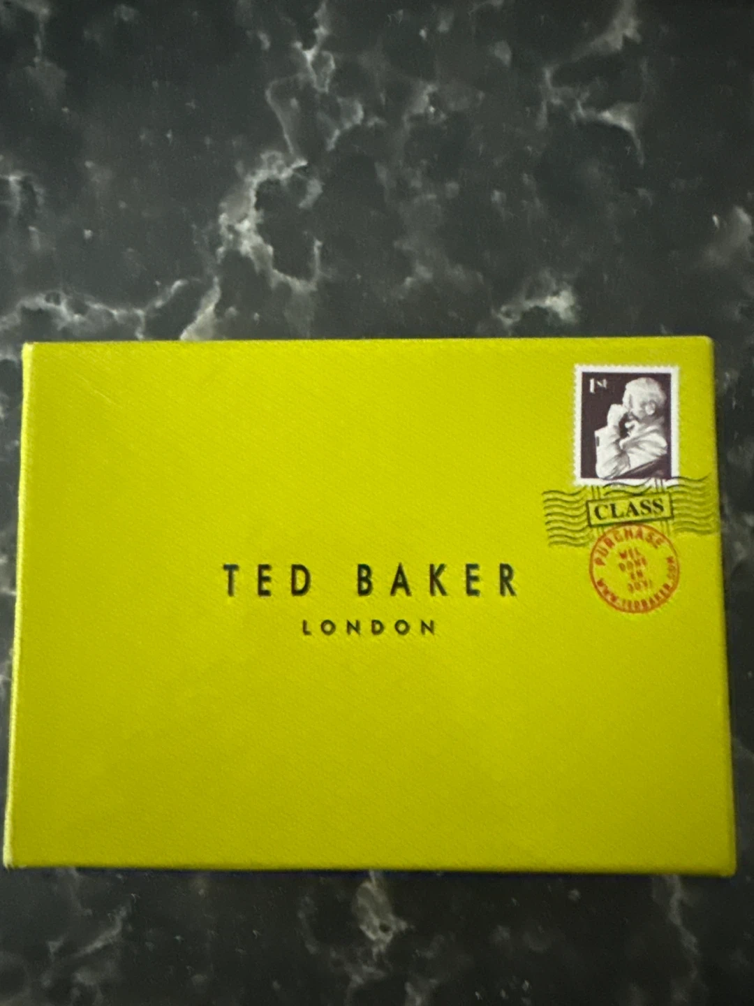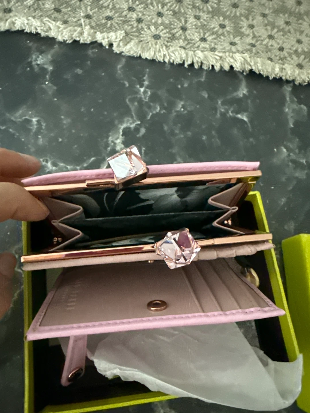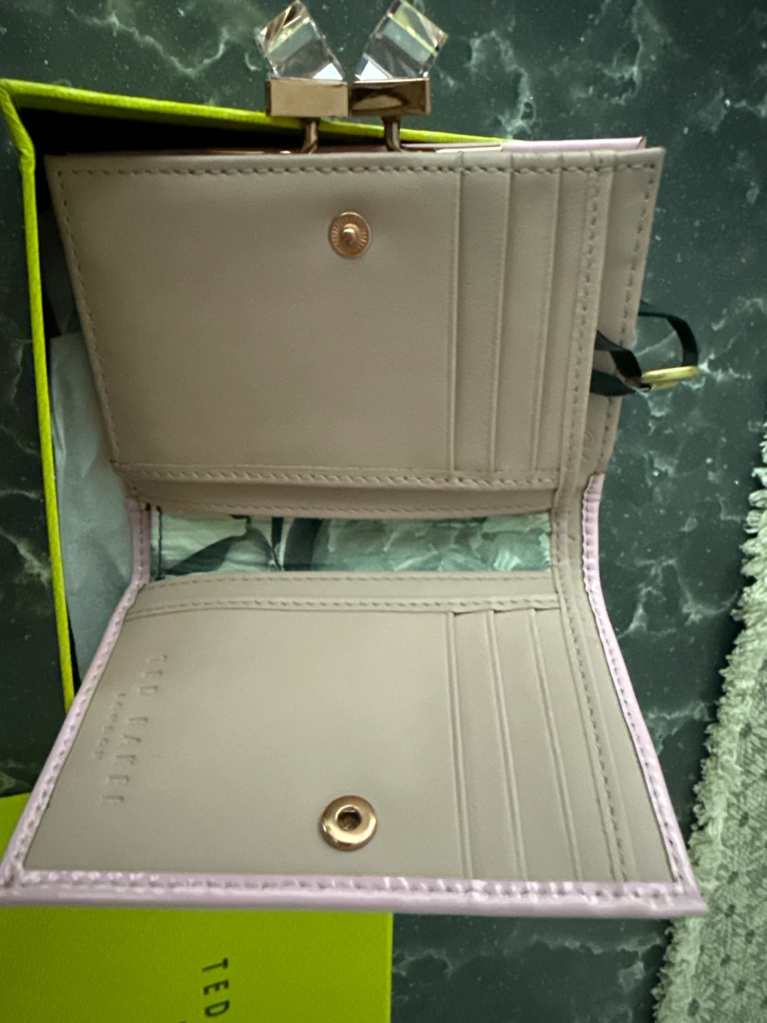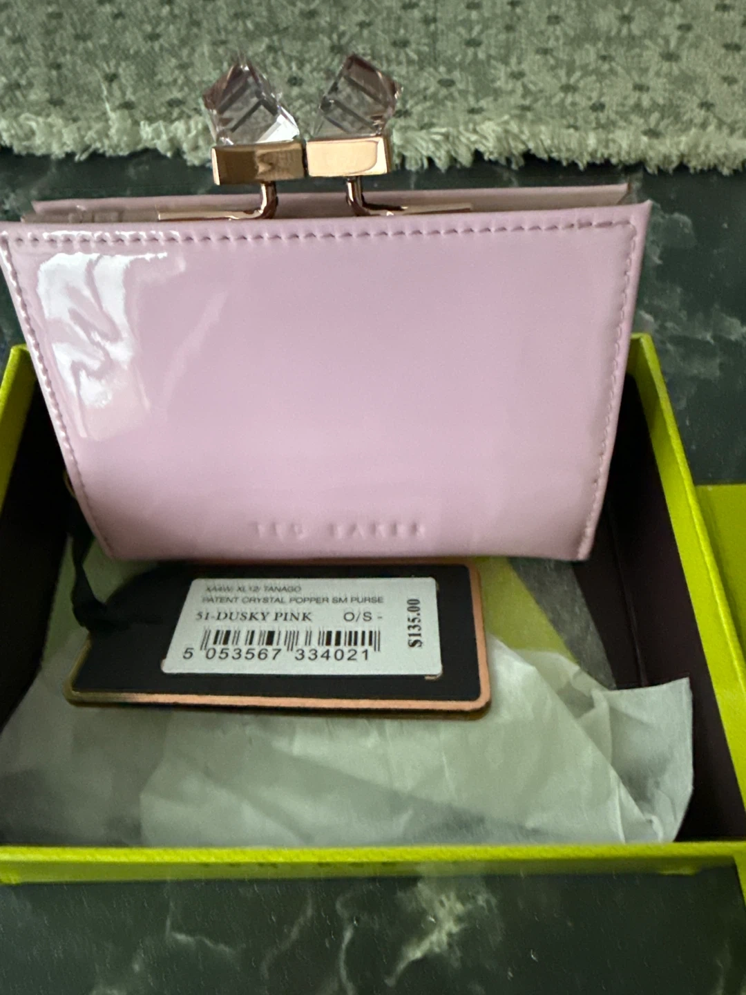 This is a Ted Baker wallet. It's a Dusky Pink (mauve pink)colour with a patent finish and rose gold crystal kiss lock, leather and printed fabric interior. Includes original box and tags.