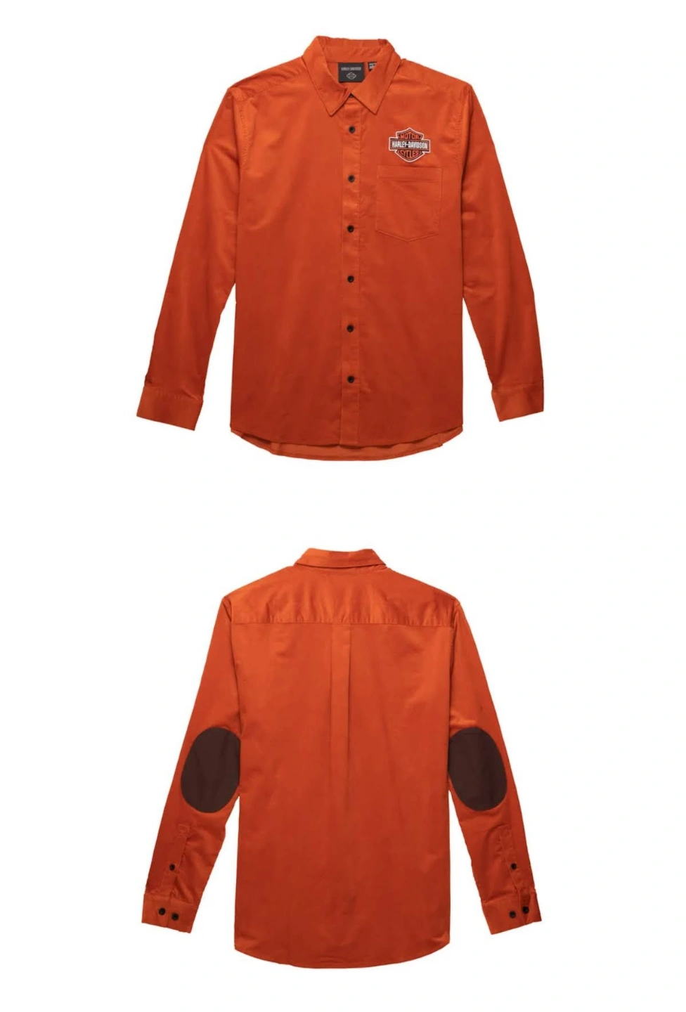 Authentic Harley-Davidson Limited Edition Bar & Shield Corduroy Shirt. Hearty cotton corduroy with a touch of spandex. Non-restrictive fit. Contrasting elbow patches. Hidden snap-down collar. Button front and cuffs. Patch chest pocket. Back pleat. Direct embroidery.