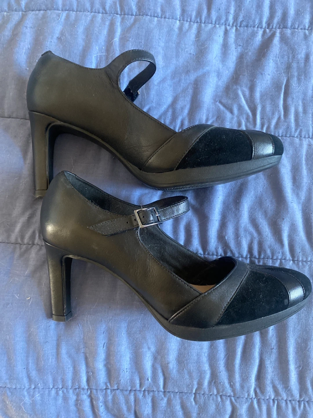 These Clarks Collection Mary Jane heels are a classic black. They feature a buckle strap and a combination of leather and suede materials. This footwear is suitable for various occasions.