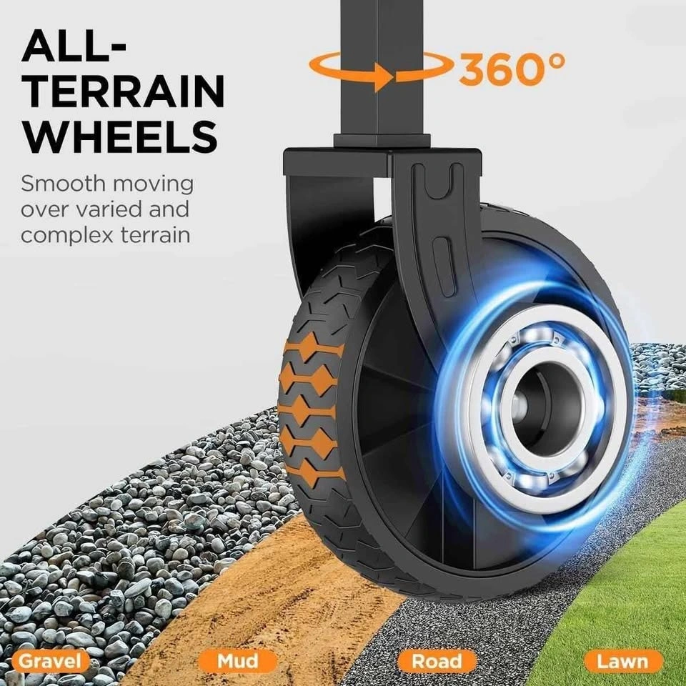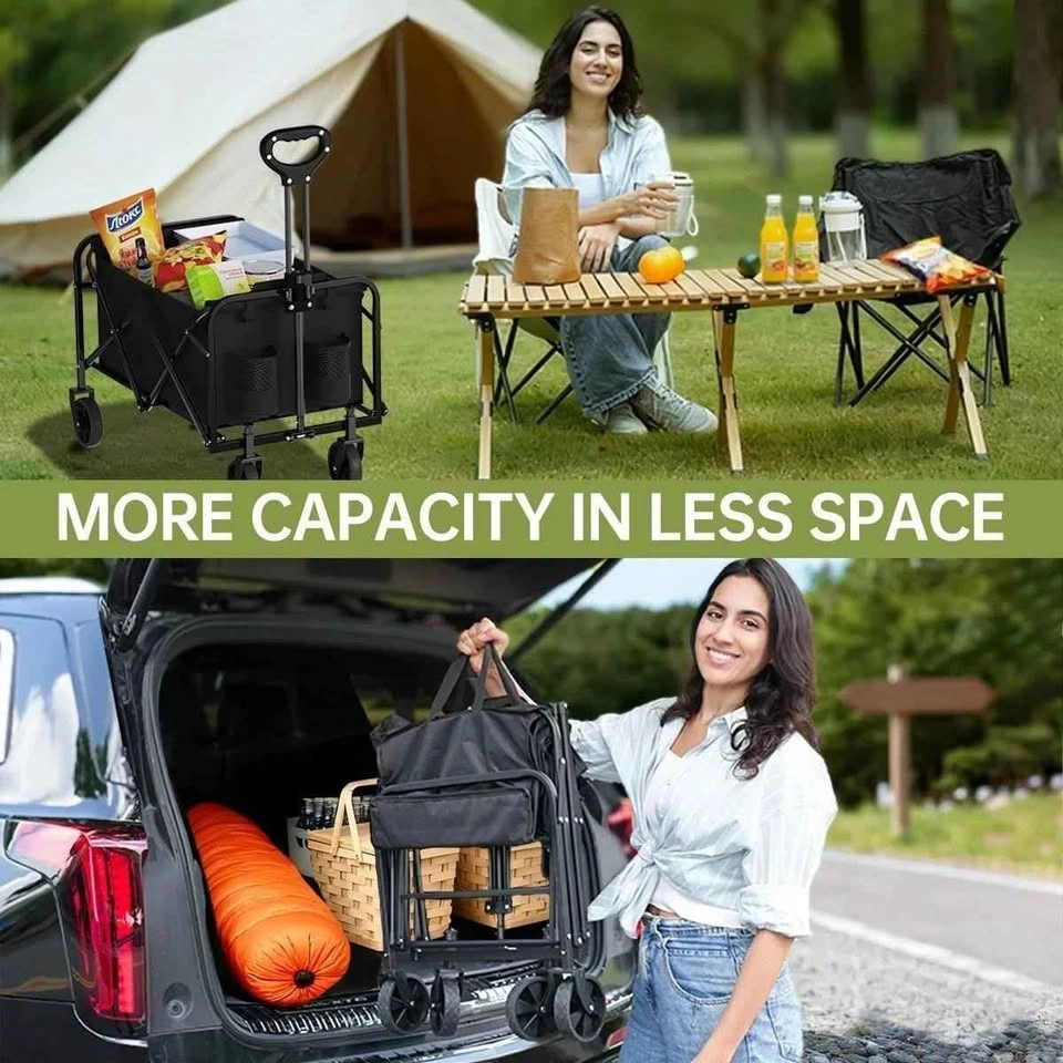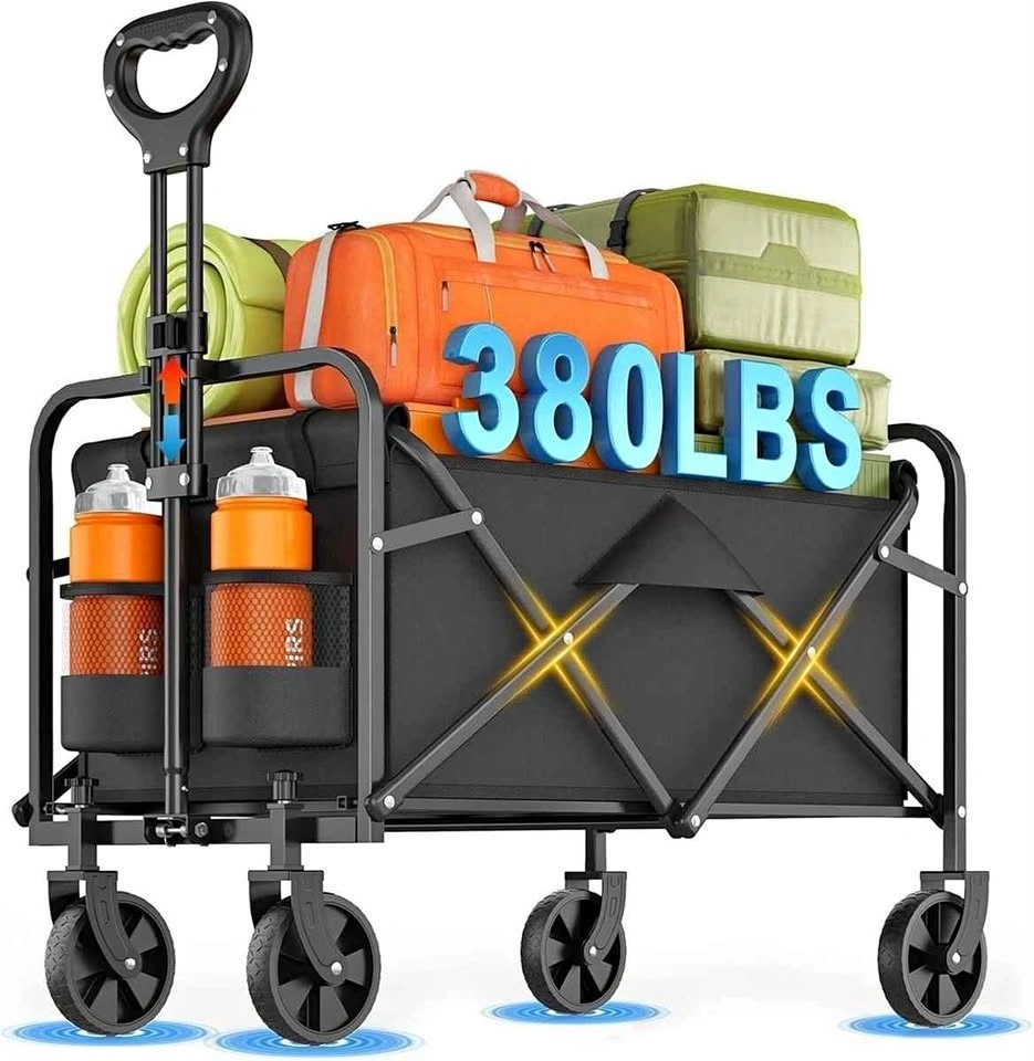 Sturdy folding wagon for all your hauling needs. This heavy-duty cart has a 380lbs weight capacity and only weighs 11lbs itself. It has all-terrain wheels that rotate 360 degrees, so it's super easy to maneuver on gravel, mud, grass, or pavement. Folds up super compact to just 5.1 inches thick, making it easy to store in your car or garage. Has an adjustable handle and handy bottle holders too. Great for camping, groceries, beach trips, or gardening.