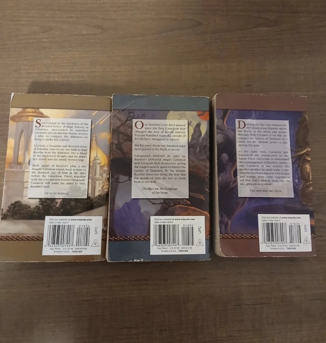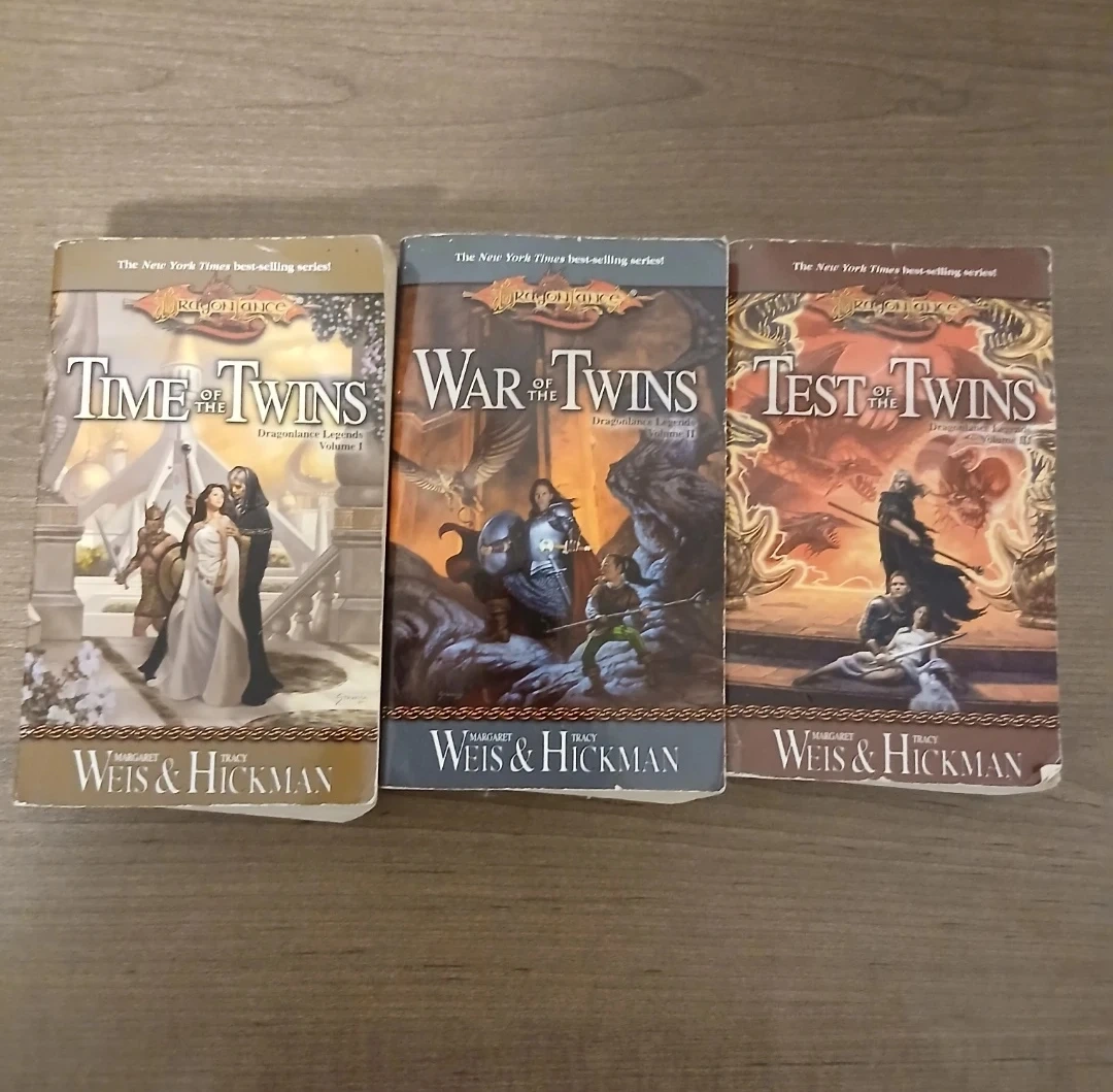 This is a set of three Dragonlance Legends novels: Time of the Twins, War of the Twins, and Test of the Twins. These books are part of The New York Times best-selling series by Margaret Weis & Tracy Hickman. Perfect for fantasy readers looking to dive into a classic series!