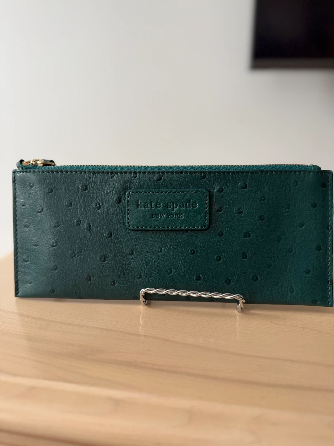 A Kate Spade wristlet with an ostrich-embossed design in a deep teal colour. It measures approximately 10 inches in length. This clutch is perfect for carrying your essentials when you're on the go!