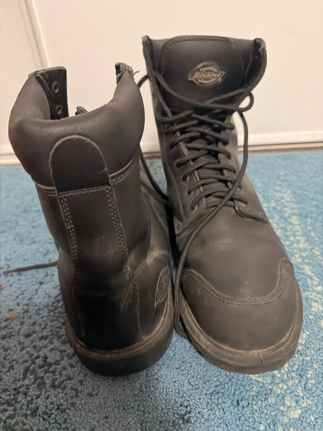 Dickies steel toe work boots in black. CAD/US size 12, Euro 47, UK 12. Made in China. Leather upper, composite sole.