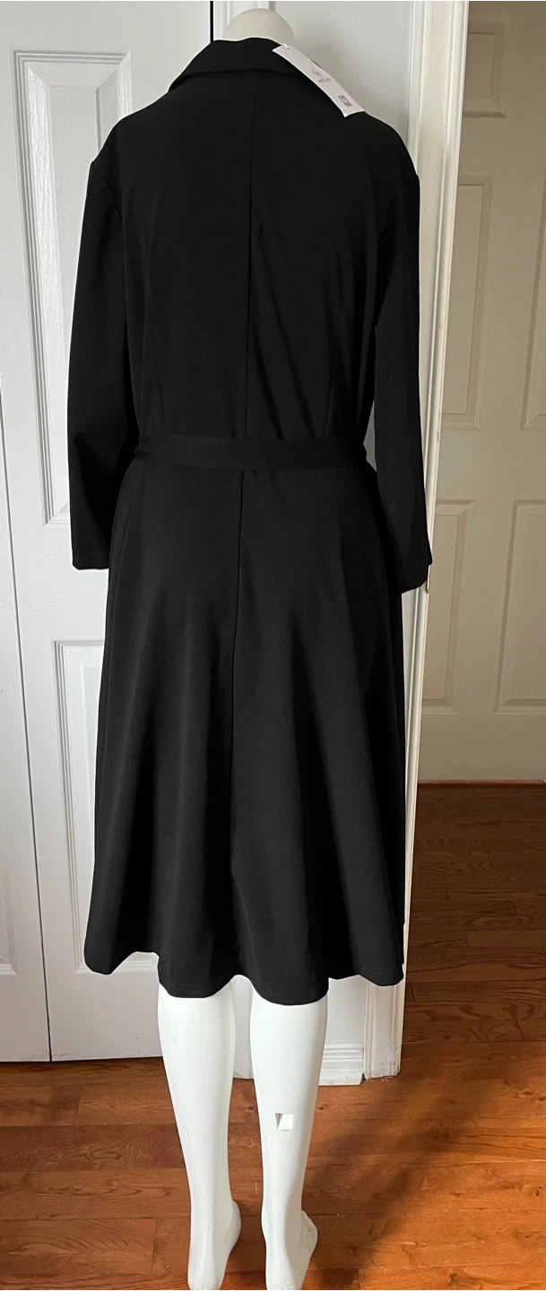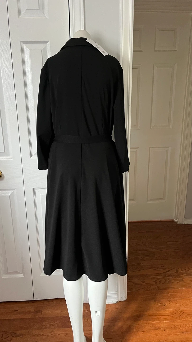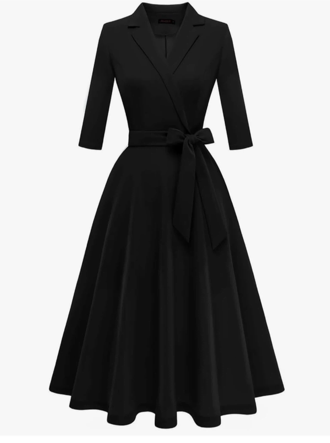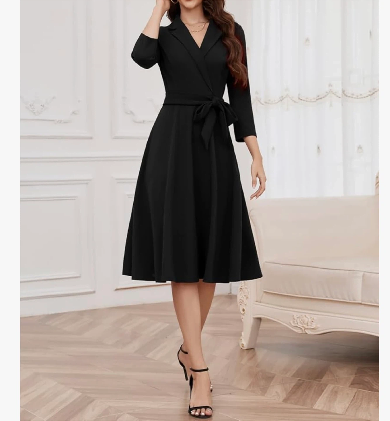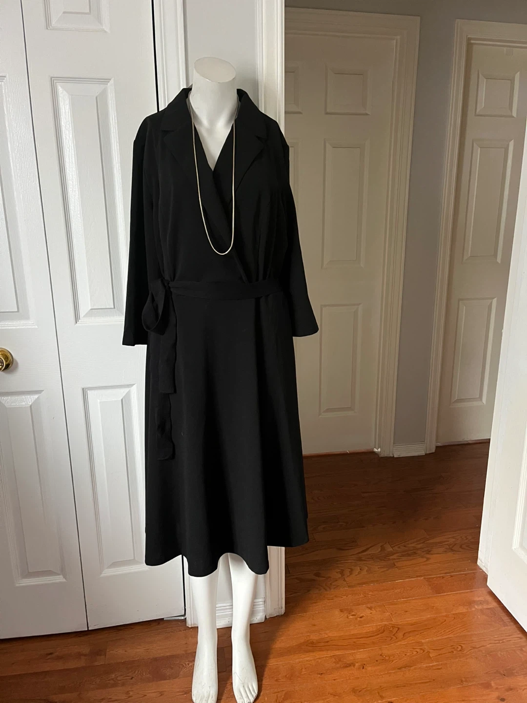 This is a MEETJEN black wrap dress. It's a size 3XL and features a tie belt. The dress has 3/4 sleeves and a V-neckline. It's a great choice for various occasions!