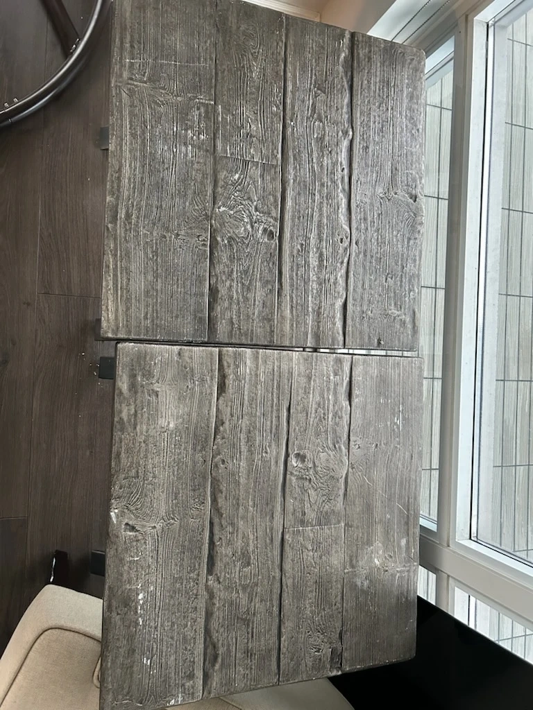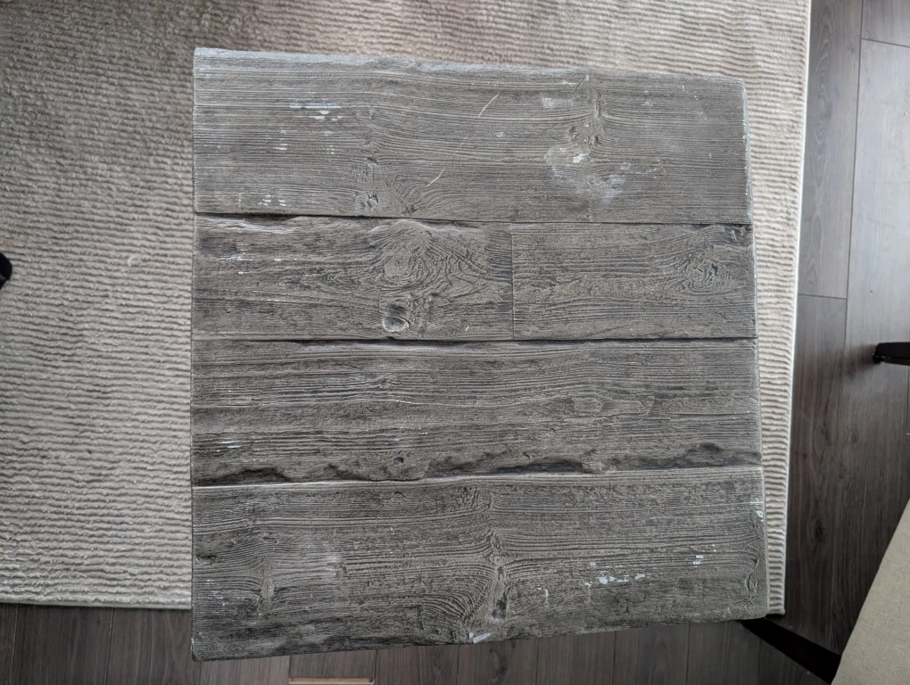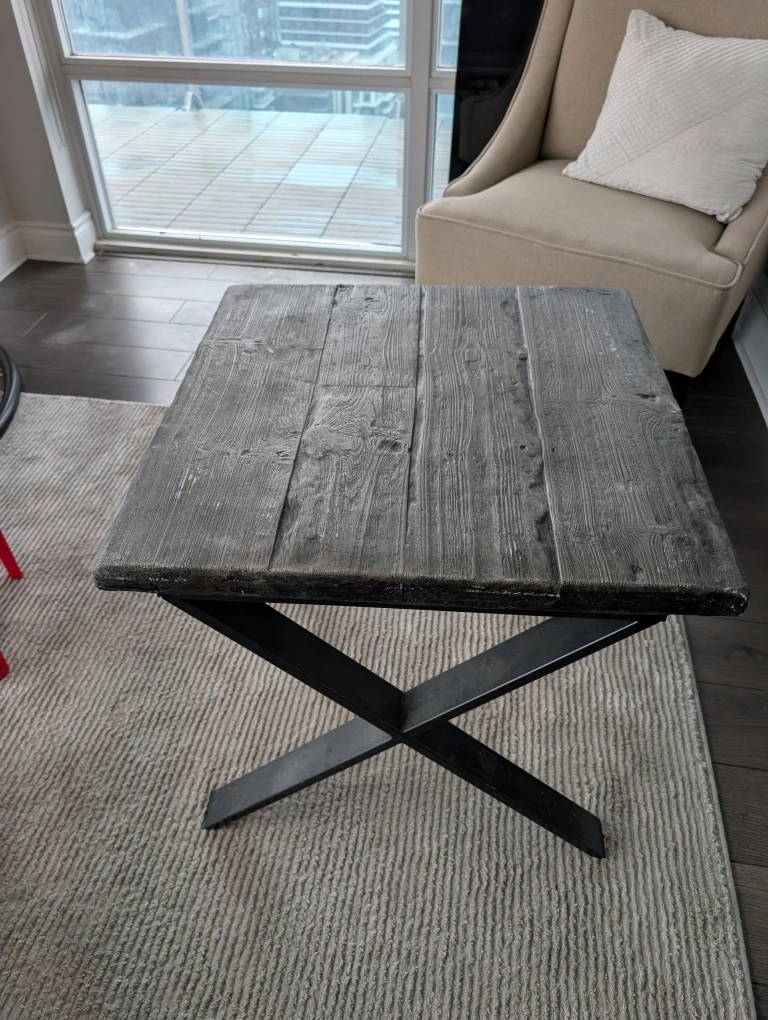 Selling two rustic-style side table with a grey wood finish. It has a unique planked top and sturdy metal legs. Perfect for adding a touch of cottage/industrial charm to your living space!