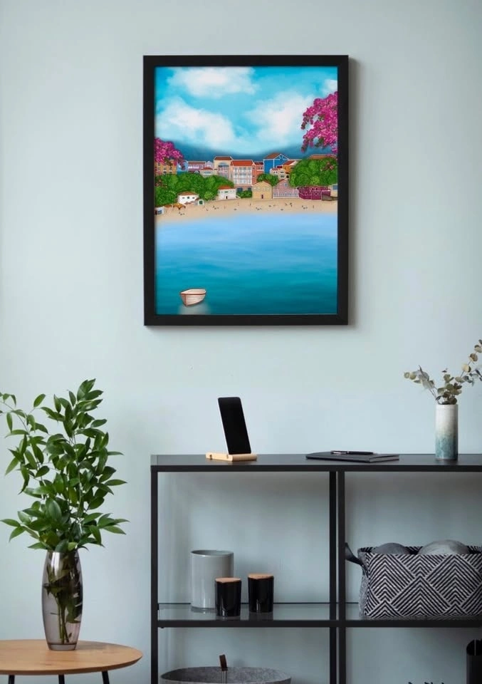 An enchanting beauty of this Greek seaside village with this captivating art print. Comes in 11in x 14in. $20 for print alone without frame (11x14). $36 for print with black frame (11x14).
