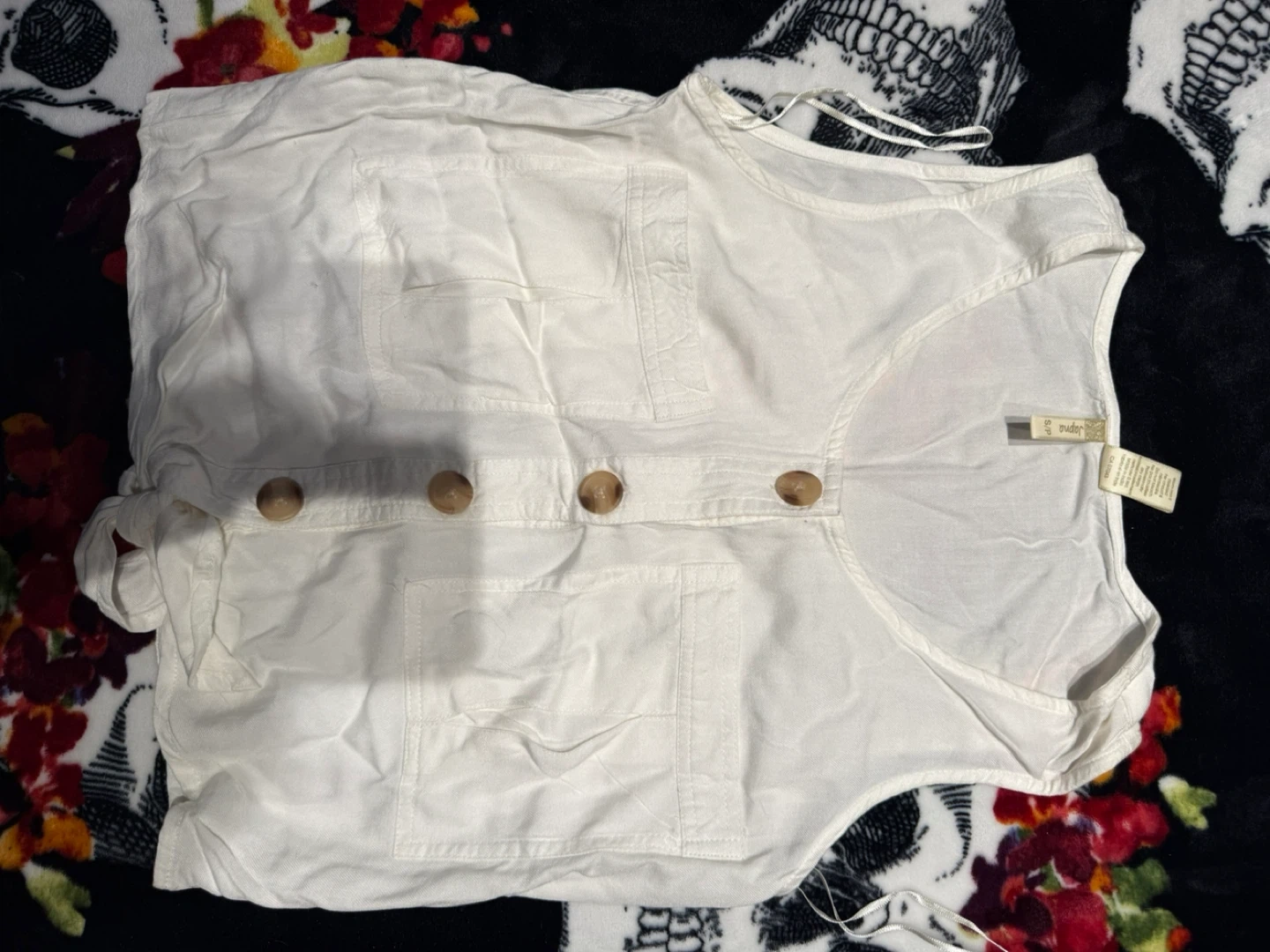 White sleeveless top with button-up front and chest pockets. It's a size small.